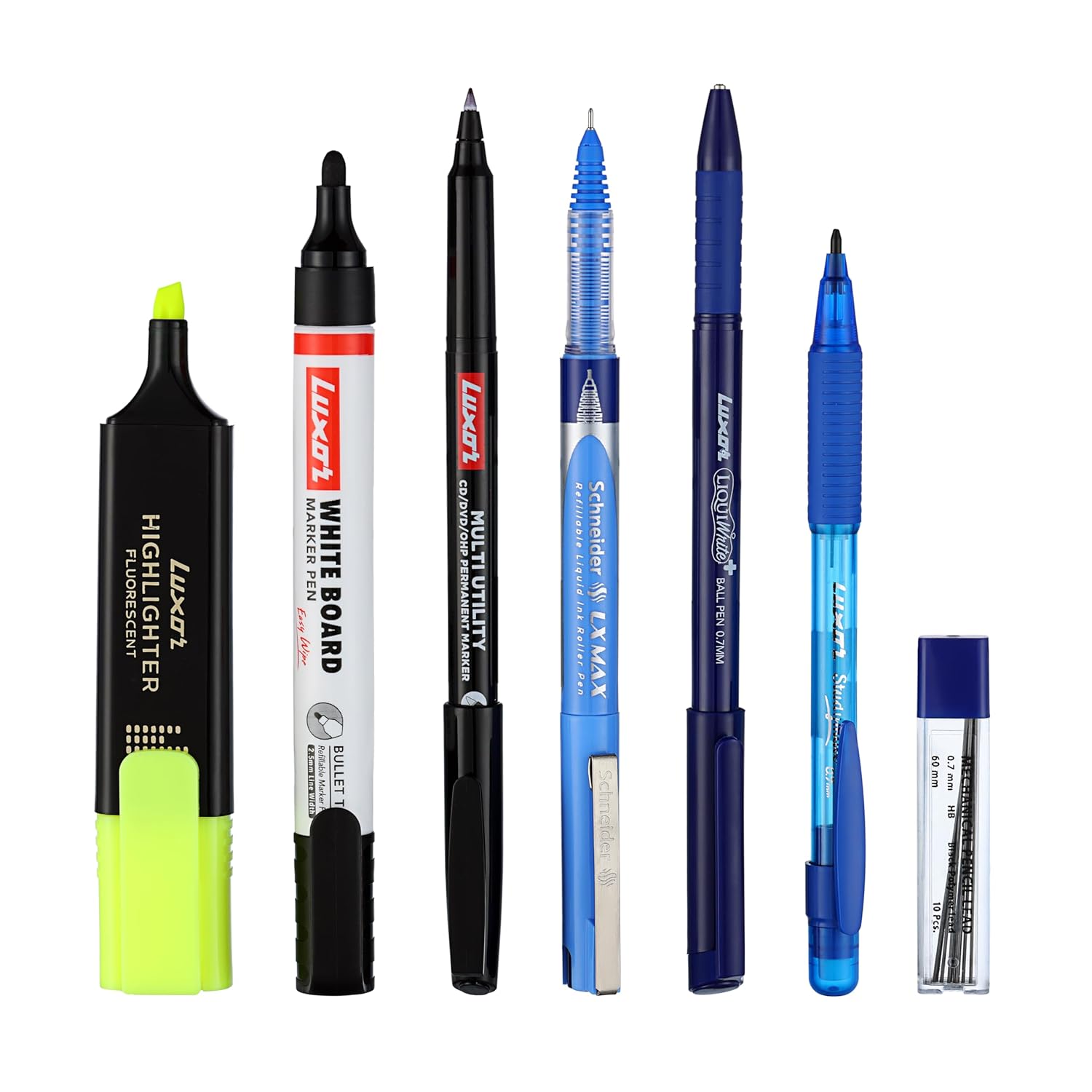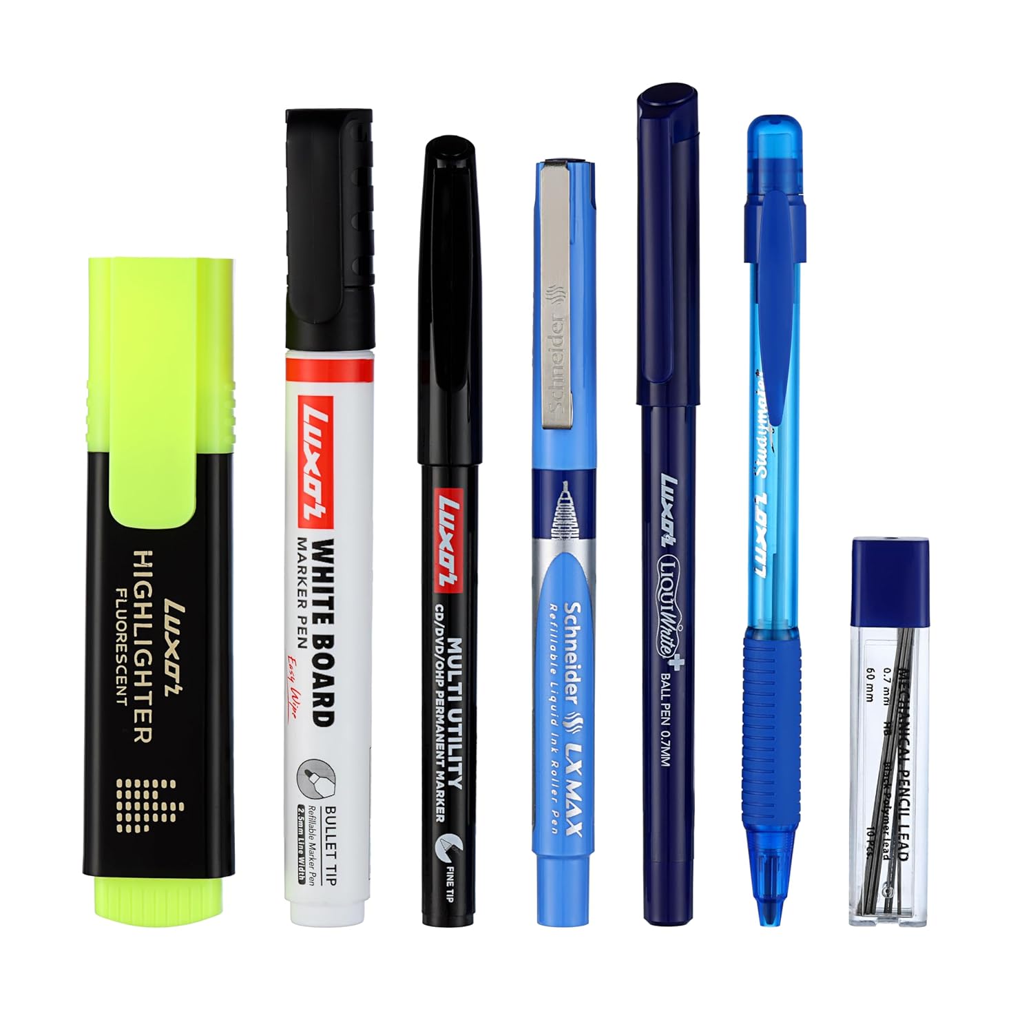 Complete Kit – Includes 7 essential writing instruments: Highlighter, Whiteboard Marker, CD Marker, Ball Pen, Roller Ball Pen, Mechanical Pencil & Lead Tube