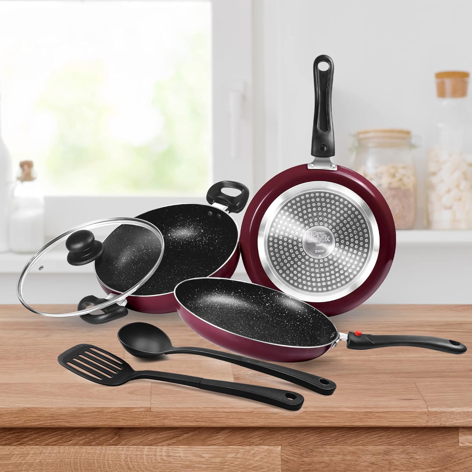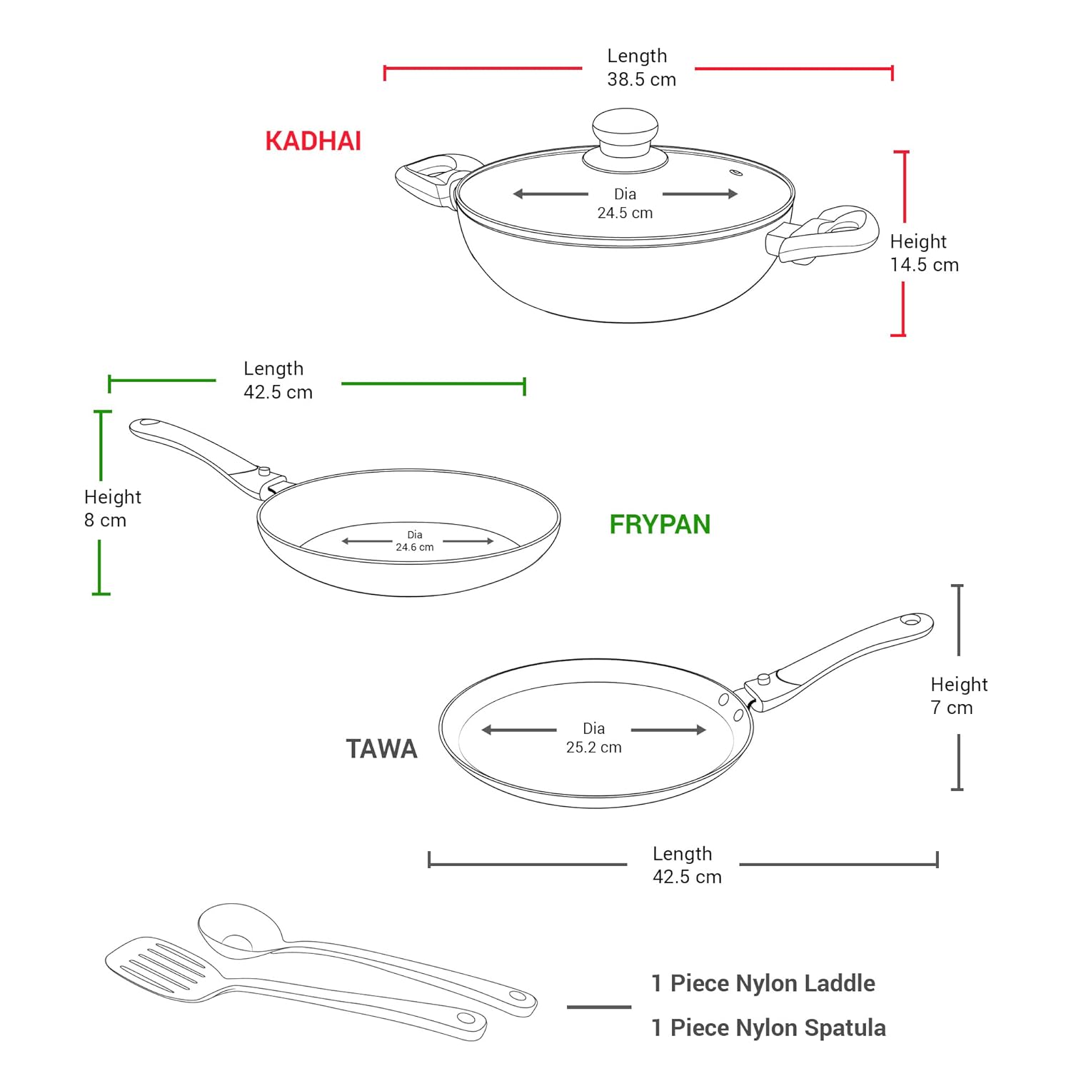 WHAT YOU GET : Peach Colour ; Material: Aluminium; Package Content: 3 – Pieces Kitchen Jewel Set (1 – Piece Fry Pan, 24 cm; 1 – Piece Kadhai with Glass Lid, 24 cm; 1 – Piece Tawa, 25 cm 1 – Piece Nylon Laddle; 1 – Piece Nylon Spatula