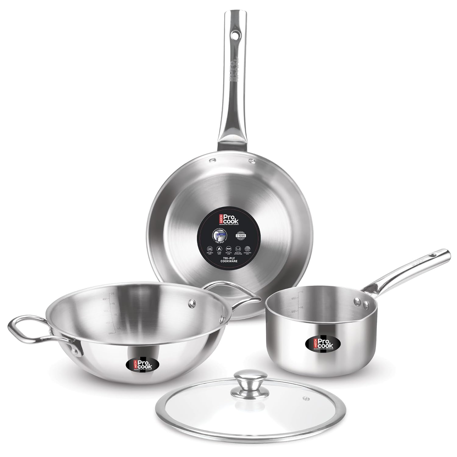 The Milton Procook Triply Stainless Steel 4-Piece Cookware Set is a perfect addition to any kitchen, offering premium quality and versatility for all your cooking needs. This set includes a 16 cm saucepan, a 22 cm fry pan, and a 24 cm Indian wok/kadai with a glass lid, all designed to provide even and fast heating for efficient cooking. The cookware is made from triply stainless steel, which combines a durable stainless steel exterior, an aluminum core for excellent heat distribution, and a stainless steel interior that is non-reactive and safe for cooking a wide range of dishes. The saucepan is ideal for making tea, boiling milk, or preparing sauces, while the fry pan is perfect for frying vegetables, meats, and making omelets. The Indian wok/kadai with a glass lid allows for cooking gravies, curries, and deep-frying, offering ample space for large quantities of food. The set also features a wooden handle on the wok and fry pan, providing a comfortable, heat-resistant grip for safe handling. Designed for both induction and gas stoves, this cookware set is versatile and can be used on any heat source. The sleek silver finish adds a touch of elegance to your kitchen, while the 3-year warranty ensures lasting quality and peace of mind. Whether you’re cooking everyday meals or experimenting with new recipes, the Milton Procook cookware set delivers exceptional performance, durability, and style.