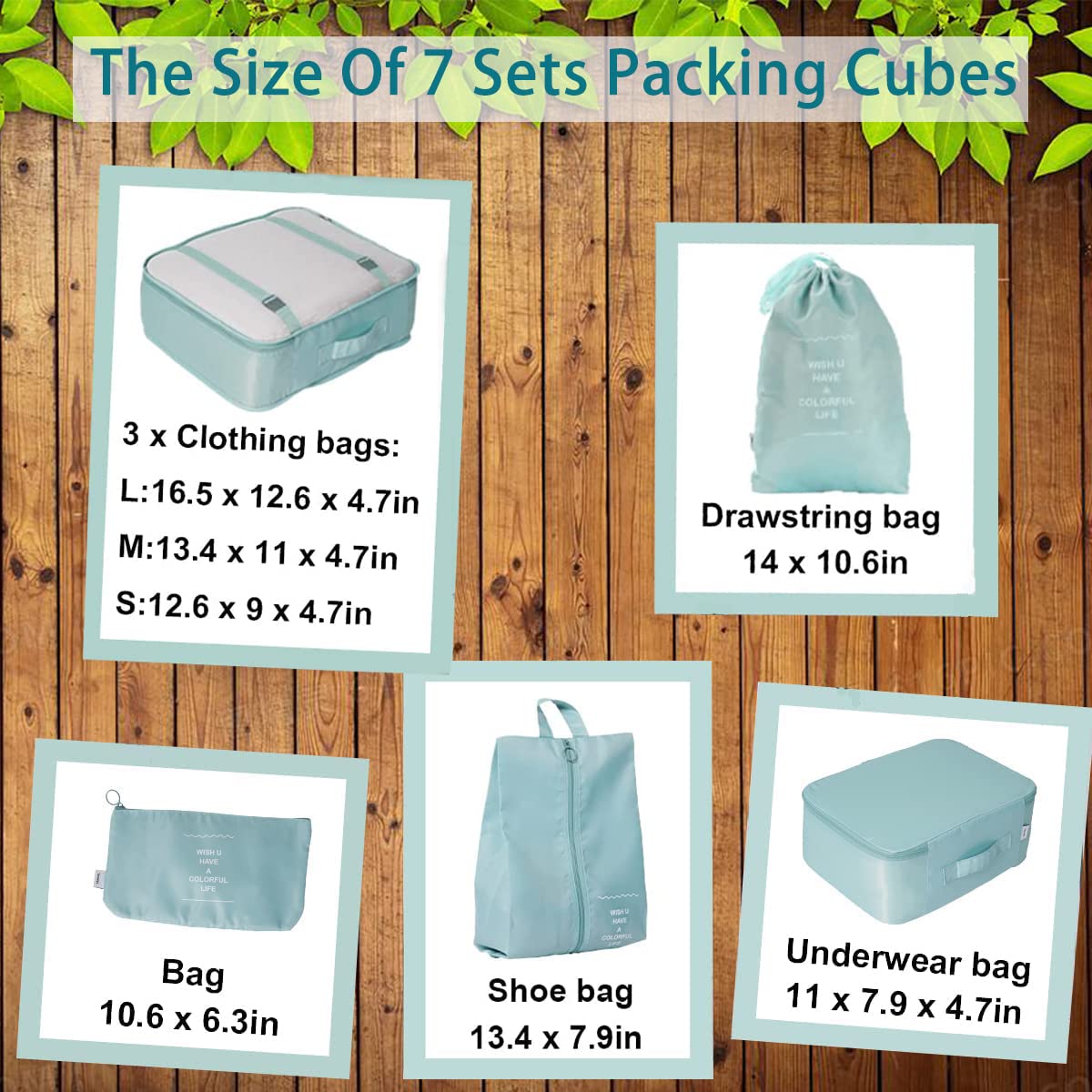 Travel Packing cube set includes 3 different size packing cubes (large:8-10 shirts, medium:5-6 shirts, small: 4-5 shirts), 1 Bra Underwear Bag, 1 Toiletry Bag, 1 Laundry Bag, 1 Shoe Bag . Travel Packing Organizers In Different sizes to meet all your needs. Keep your suitcase neat and orderly, save space and store more items