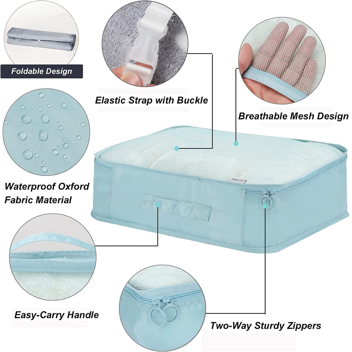 Travel packing cubes’ soft and smooth mesh top panel not only protect your delicate clothes from wrinkles and odor, but also help you identify your clothes through its see-through mesh, saving you time. The new buckle design of the compression packing cube allows clothes to be stored without scattering. Keeping the articles clean and reduce the clothes’ wrinkles and other travel damage