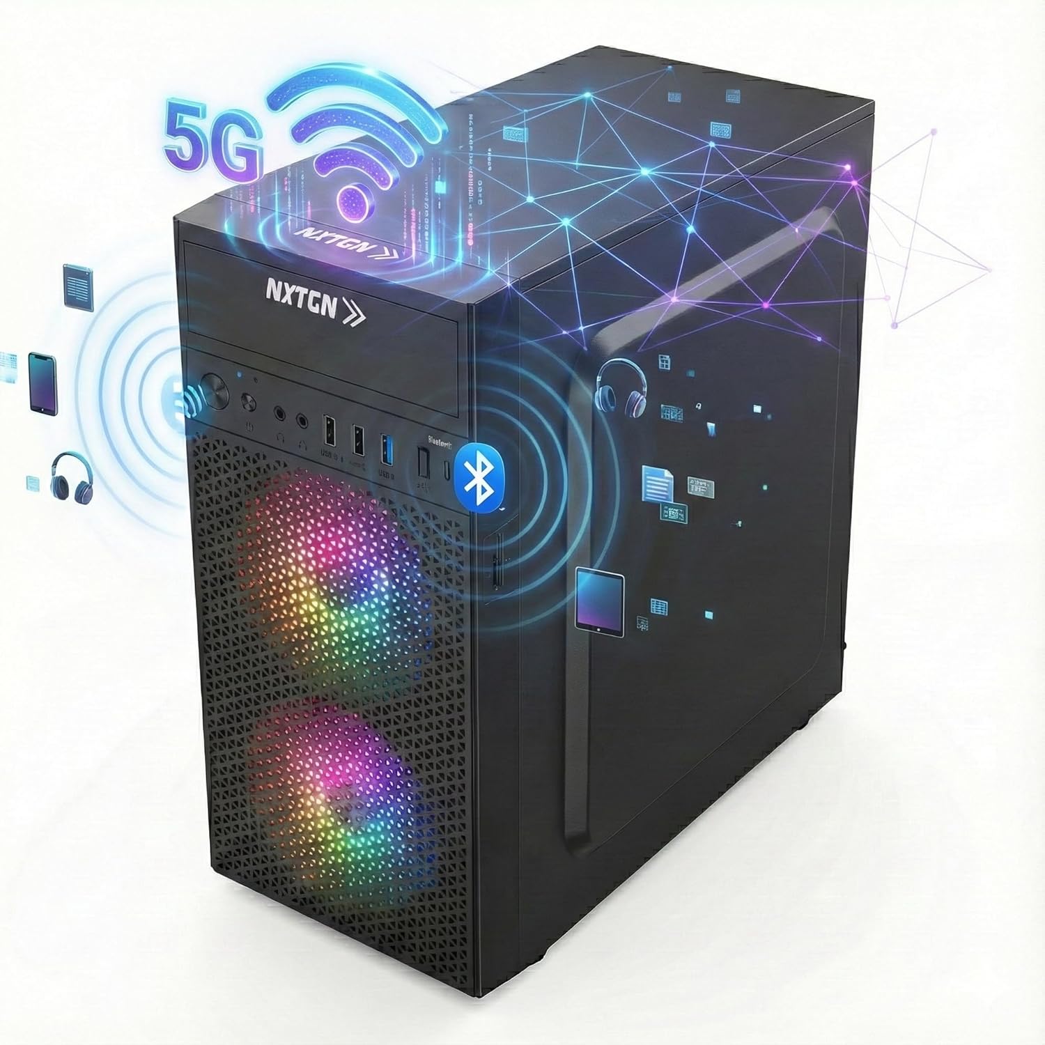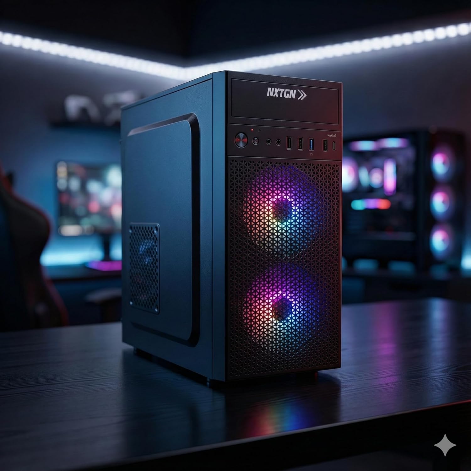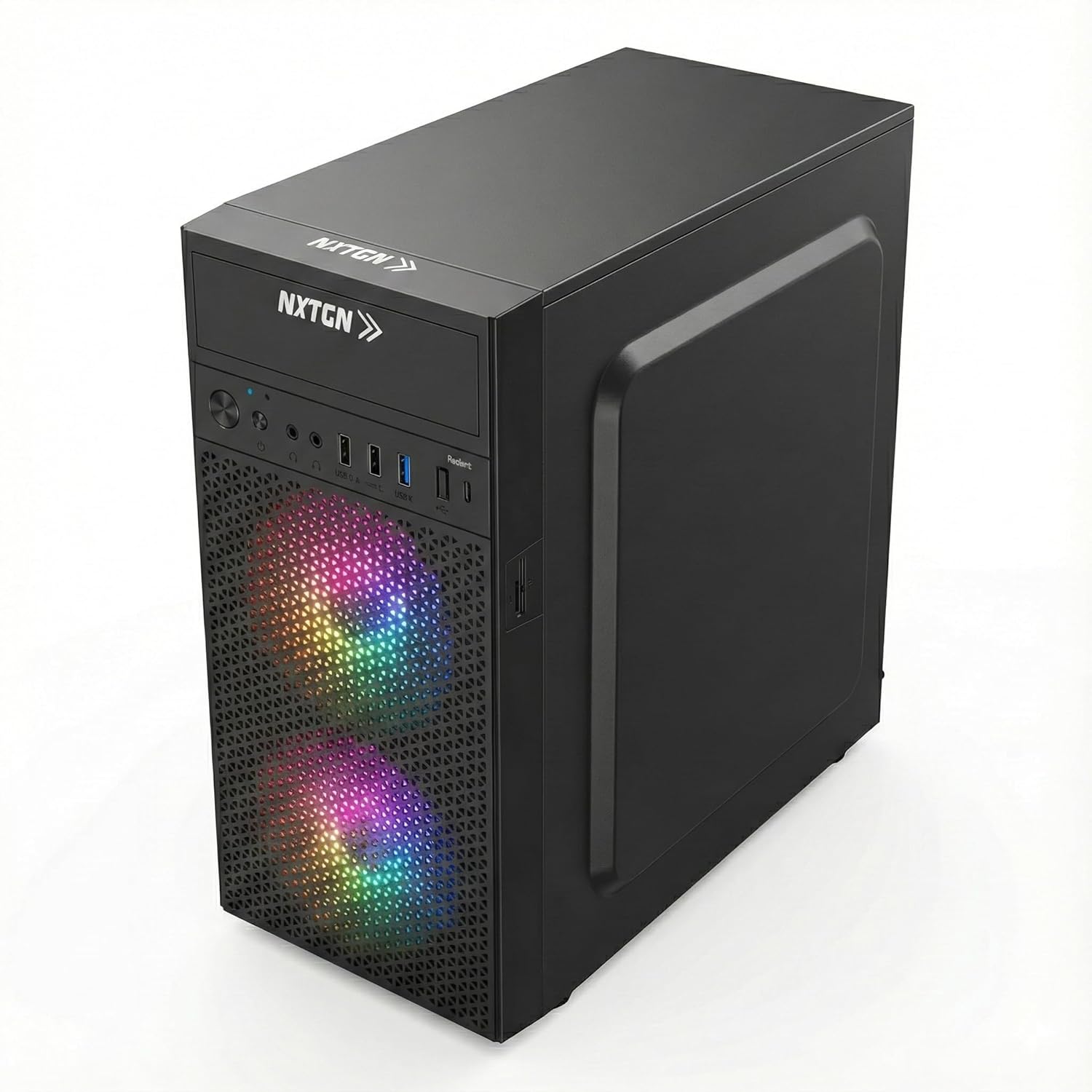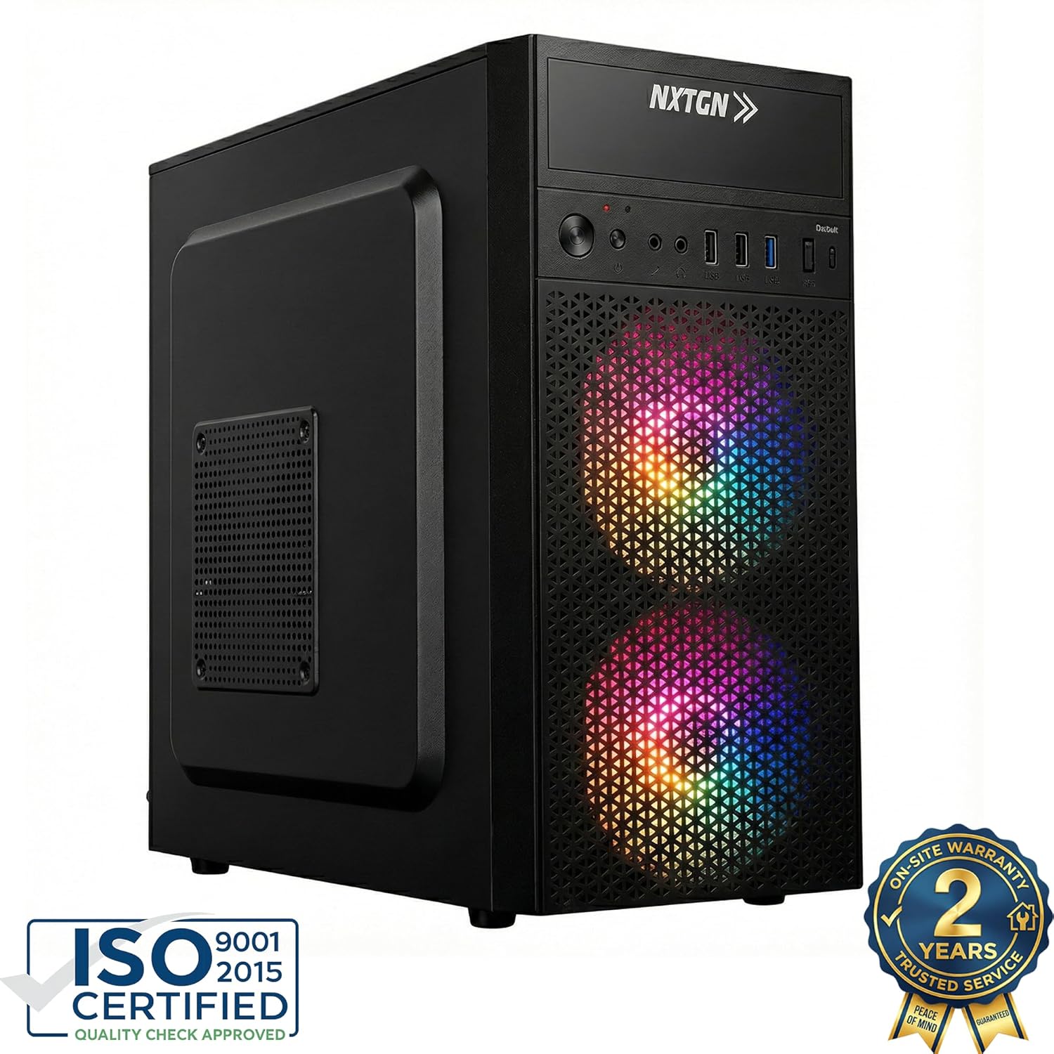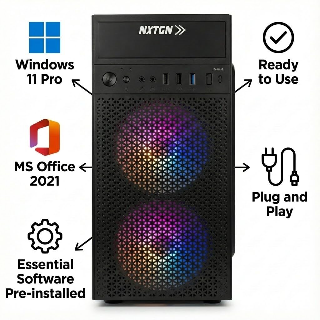 🛡️ 2-YEAR ON-SITE WARRANTY & RGB AESTHETICS: Buy with total confidence. NXTGN offers a 2-Year Comprehensive On-Site Warranty, ensuring peace of mind. Housed in a premium black cabinet with Dual Front RGB Fans and a mesh grill, it provides excellent airflow cooling and a modern, stylish look for your desk.
