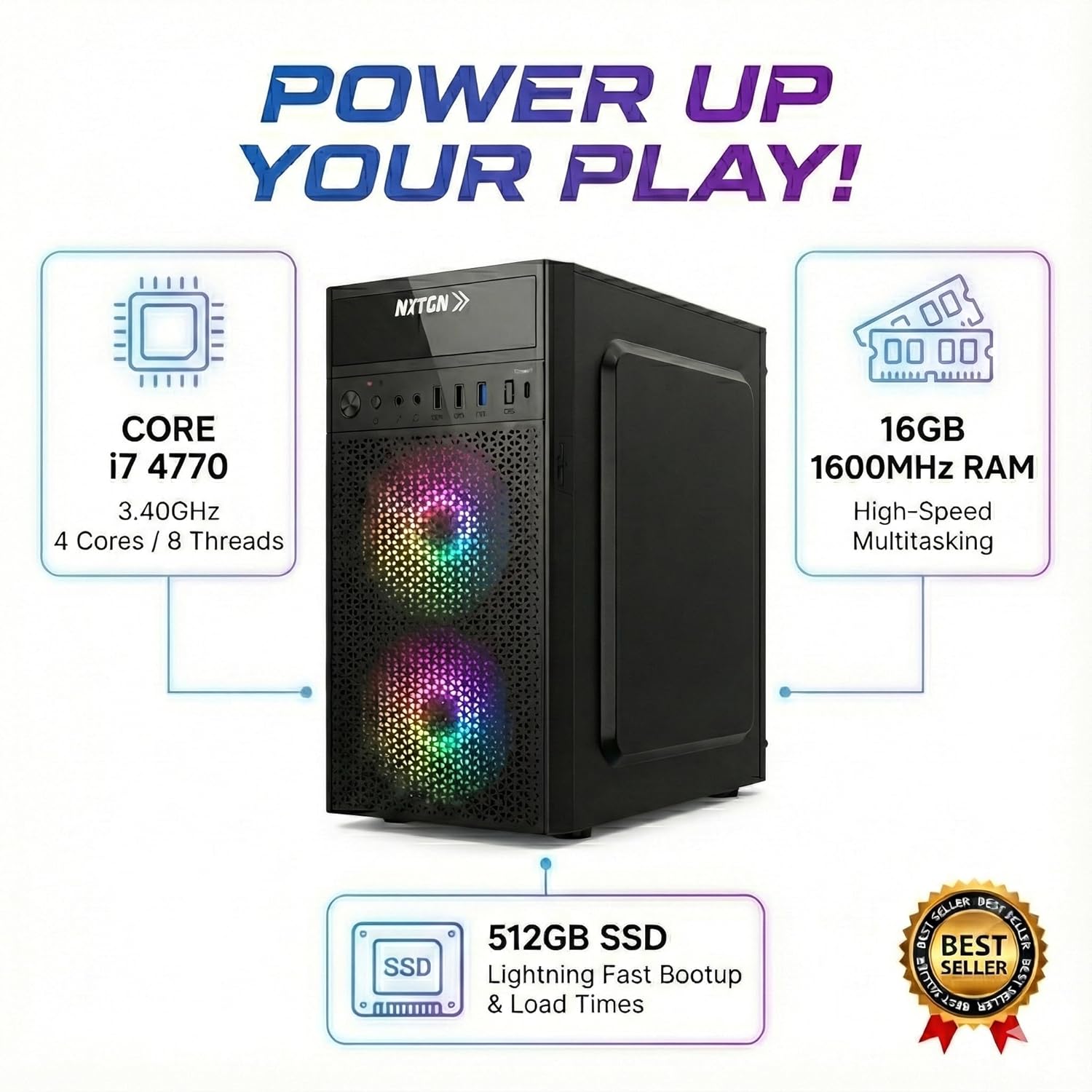 Experience next-level computing with the NXTGN Desktop PC, powered by a robust Core i7 processor and 16GB RAM for seamless multitasking. Whether you are editing videos, managing business spreadsheets, or gaming, the 512GB SSD ensures lightning-fast boot times and instant app loading.