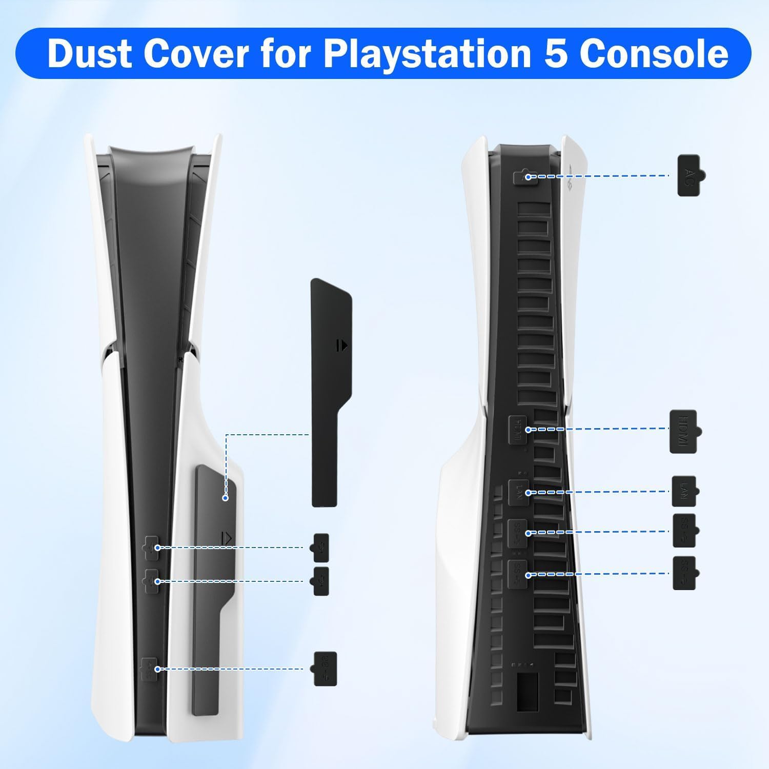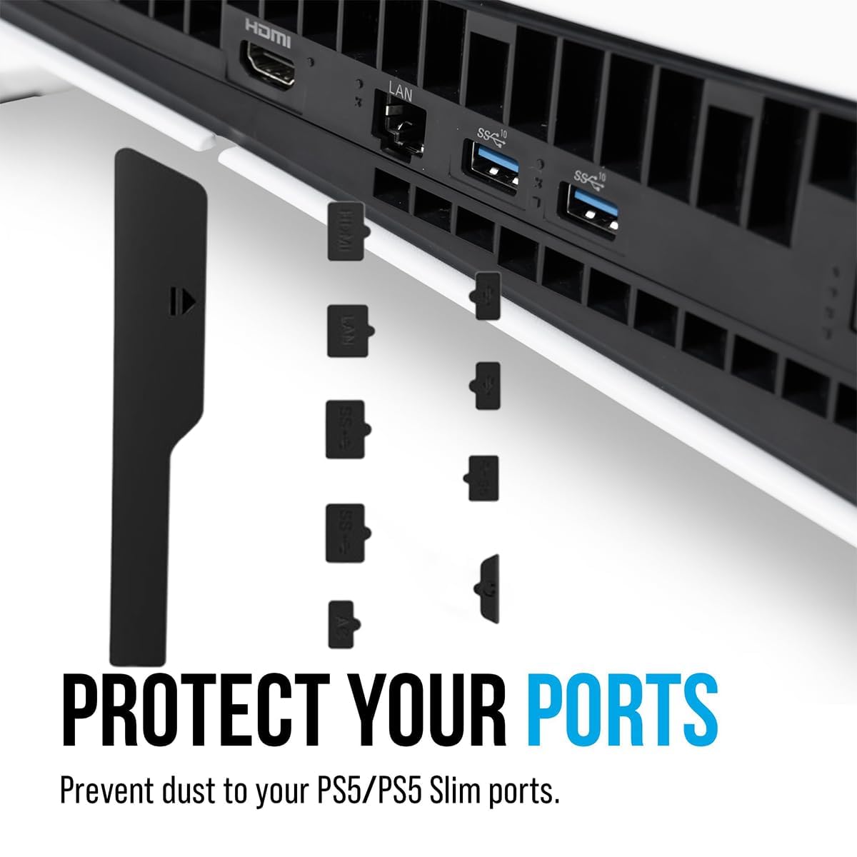 ENHANCED PROTECTION: Each plug in the kit is specifically designed to cover all exposed ports and sockets of your gaming console, effectively preventing dust accumulation that can lead to overheating or damage to the internal components. Keep it clean and perfect for protecting ports from dust, dirt, lint and oxidation rust, providing comprehensive protection for your PS5 without a bulky dust cover.