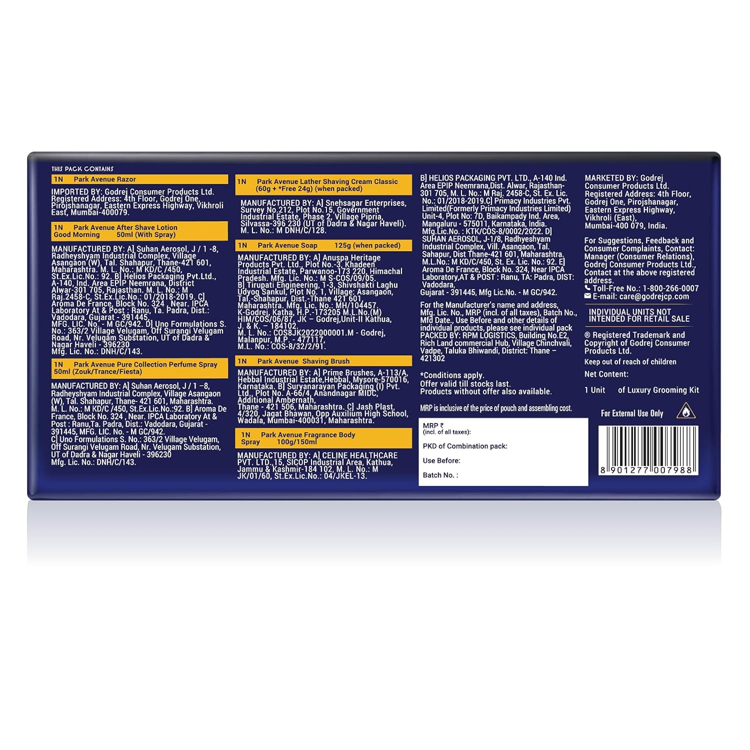 Included Components : Park Avenue Fragrance Body Spray (150 ml), Park Avenue Deo Talc (100g), Park Avenue After Shave Lotion (50ml), Park Avenue Fragrant Soap (125g), Park Avenue Lather Shaving Cream (84g), Park Avenue Shaving Brush (1N), Park Avenue Razor (1N)
