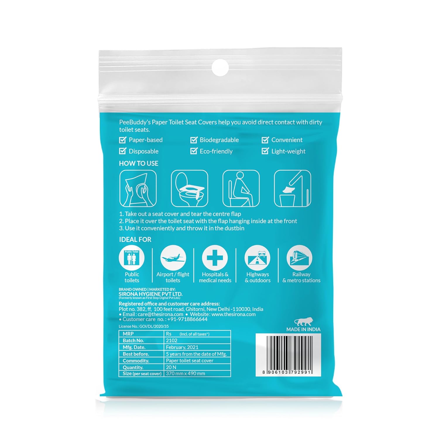 Packer : Sirona Hygiene Private Limited, Plot No.382, First Floor, 100 Feet Road, Ghitorni, New Delhi – Delhi – 110030, Email: info@thesirona.com, Contact Number: +919718866644