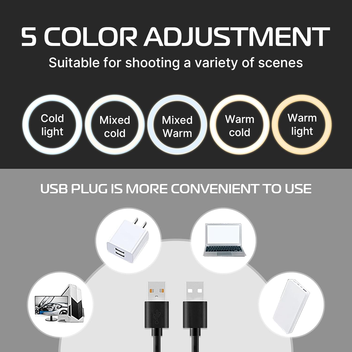 🎨 5 Adjustable Color Temperatures – Easily switch between 3200K to 5600K (warm to cool tones) to match your environment or content mood.
