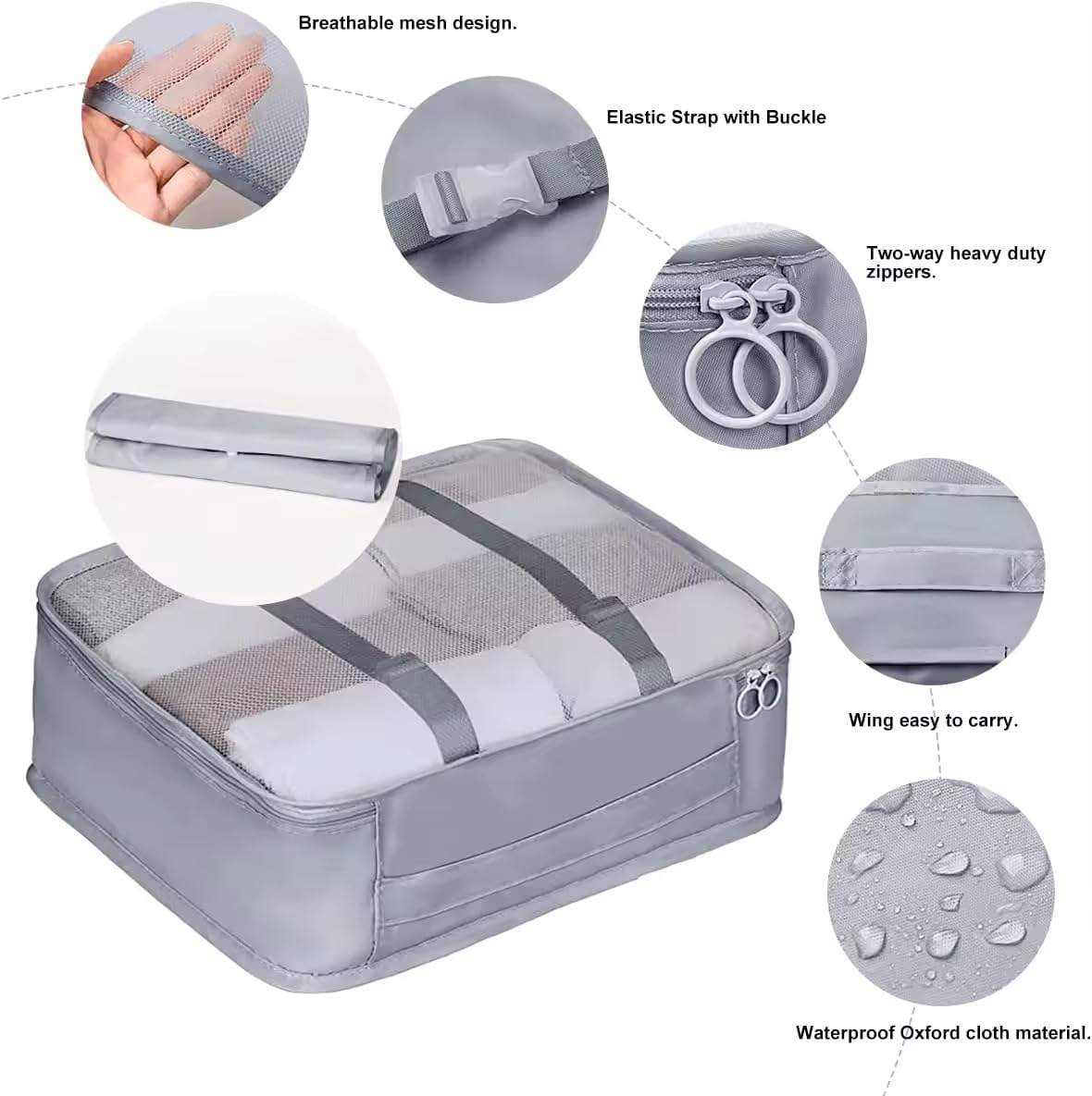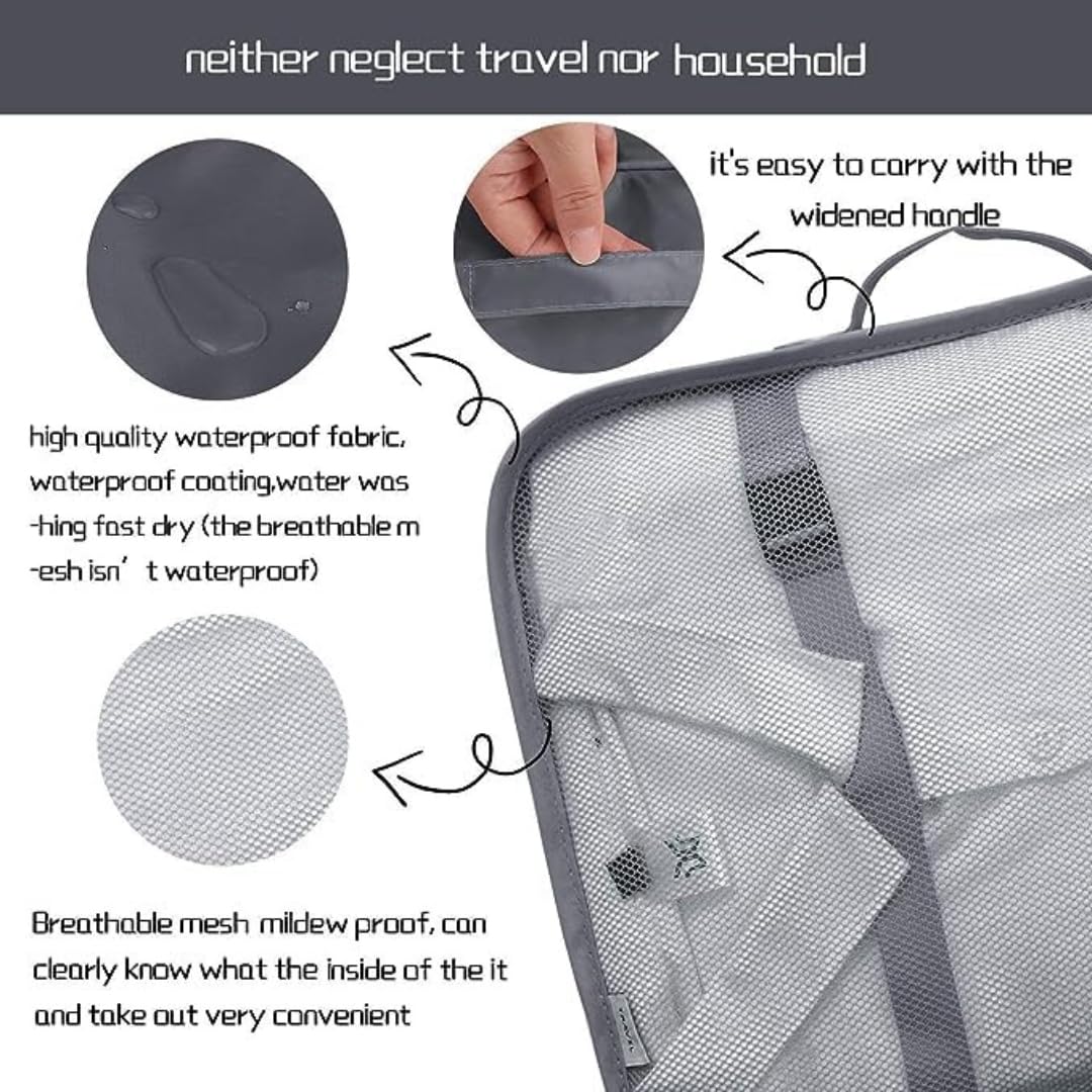 AMAZING PACKING CUBE SET INCLUDES : 6 pcs packing organizers set ( 3 different size clothes storage bags or cubes + 3 laundry pouches which can also be used as 1 bra/underwear bag , 1 cosmetics bag , 1 toiletry bag + 1 bonus drawstring shoe bag). The 3 laundry pouch can be used for your used clothes while the compression garment bag can be used for footwears.