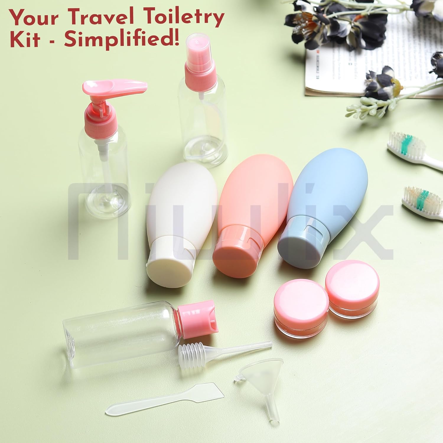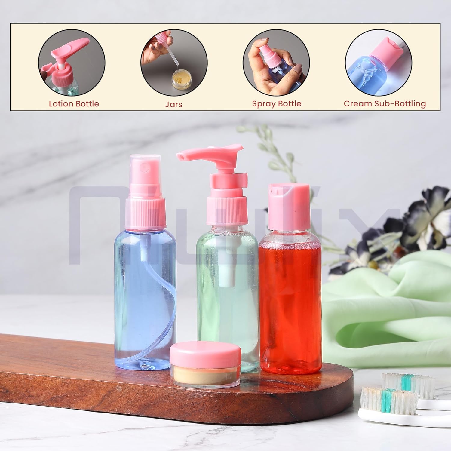 Includes pump bottles, spray bottles, cream jars, and squeeze tubes – all in one set.