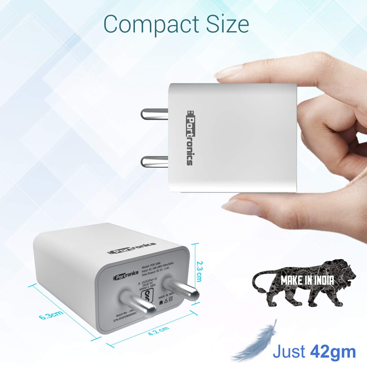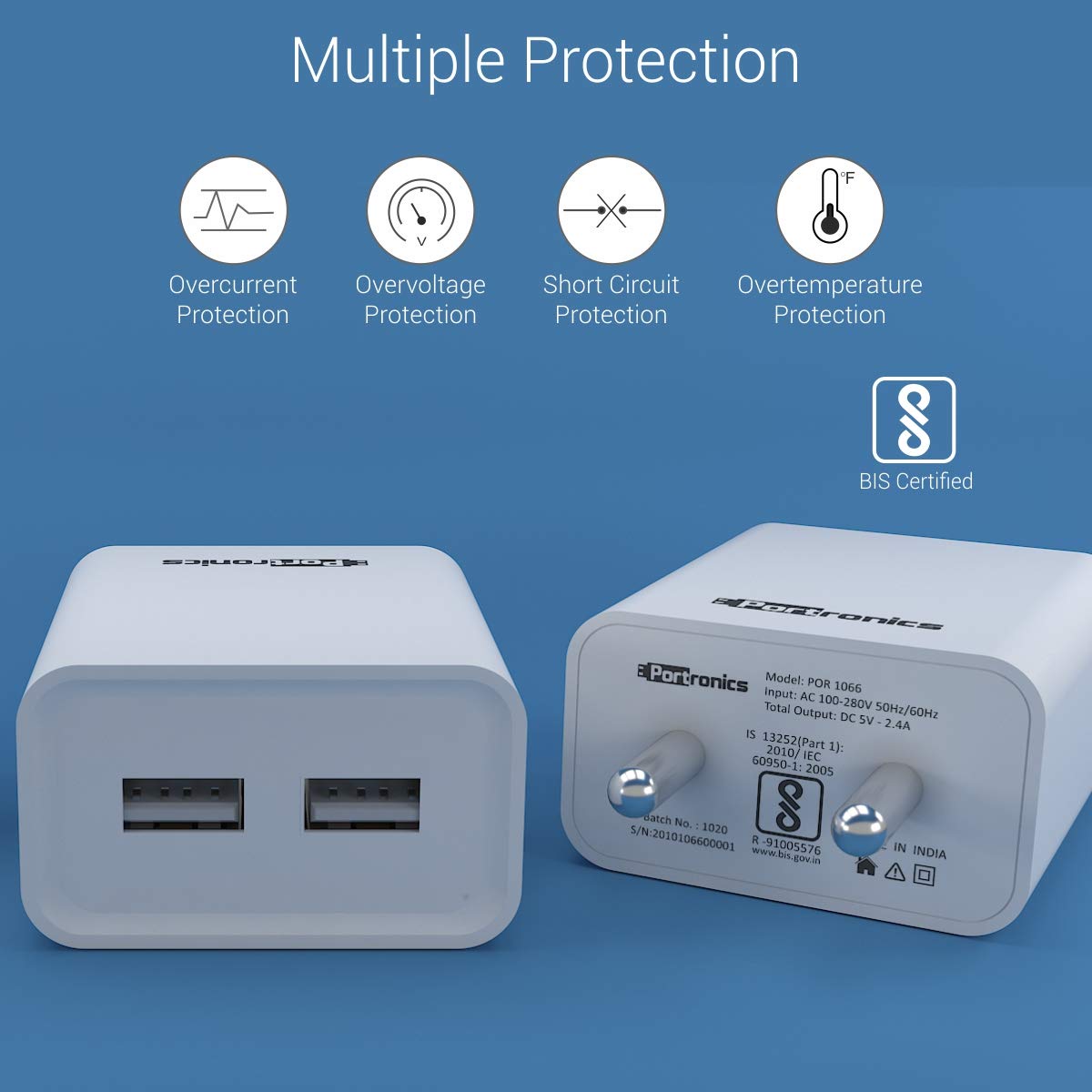 About this item Portronics Adapto 66 2.4A 12w Dual USB Port 5V/2.4A Wall Charger,Comes with 1M Micro USB Cable. Intelligent Protection The adaptor comes with intelligent protection, which prevents overcurrent, overvoltage, overheating, and keeps the device temperature controlled. It also automatically stops charging, when the device is fully charged. Lightweight & Portable: Like all Portronics products, the Adapto 66 is also extremely portable, and lightweight. It is a wonderful travel accessory to save you from the hassle of carrying multiple adaptors. Compatibility The adaptor supports to all 5V Devices.You can easily charge your Smartphone,iPhone,,iPad Pro/Air 2/Mini 3/Mini 4,Samsung,Power bank,mp3 player,Bluetooth neckband etc. COMPACT SIZE Slim & compact and lightweight body takes up minimal space and looks elegant SAFE, DURABLE & RELIABLE It auto detects and delivers the optimal charging power to connected device. This device has Fire Retardant body, is BIS Approved, and protects from over-heating, over-current, over-charging