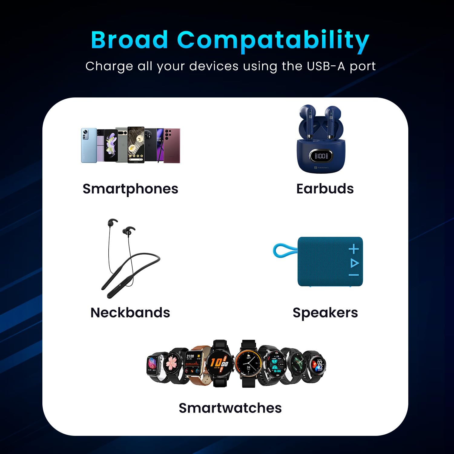 USB Output Port: Fast charge your devices using the 12-watt USB output port on the power bank. Compatible with- smartphones, speakers, neckbands, earbuds, smartwatches, etc.