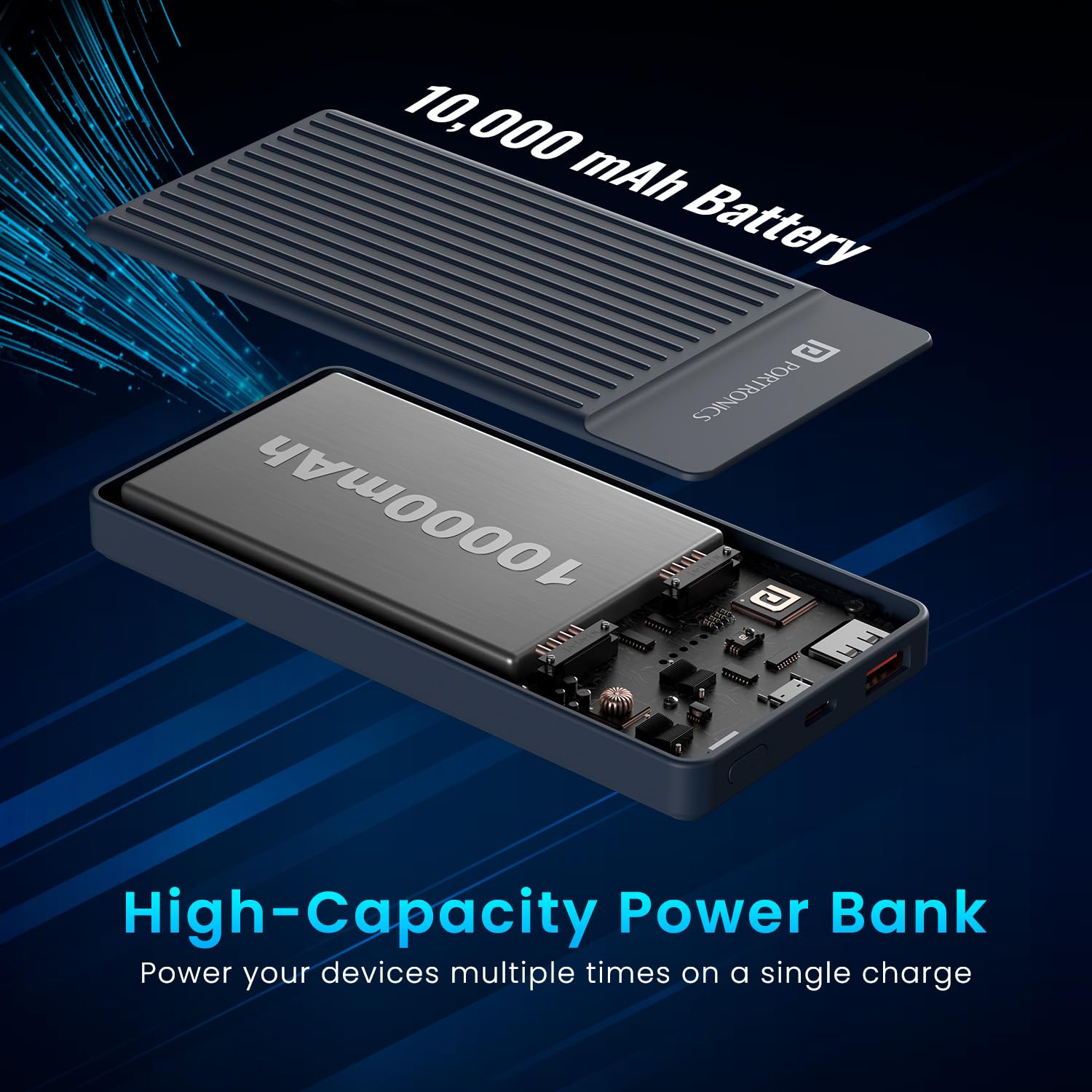 10,000 mAh Power Bank: Portronics Luxcell B12 is a fast & efficient power bank with a max output of 12 watts. Charge your devices multiple times with this 10,000 mAh battery high-capacity power bank.