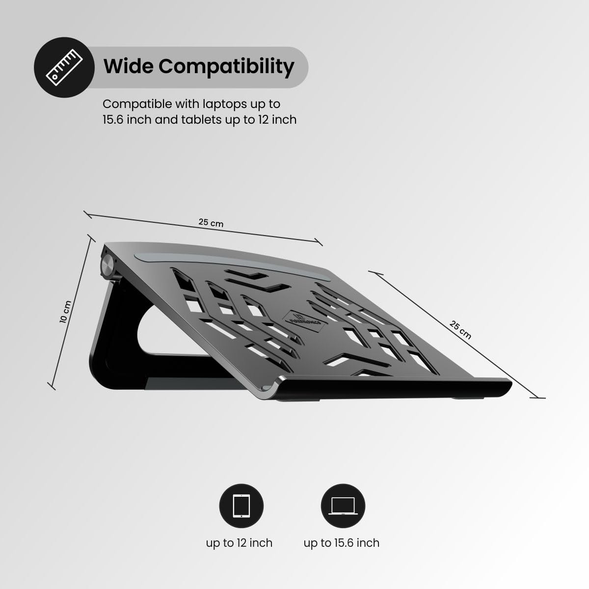Laptops Up to 15.6”: Designed to accommodate laptops and MacBooks up to 15.6 inches in size, this sleek black stand is an excellent choice for enhancing your workspace and productivity.