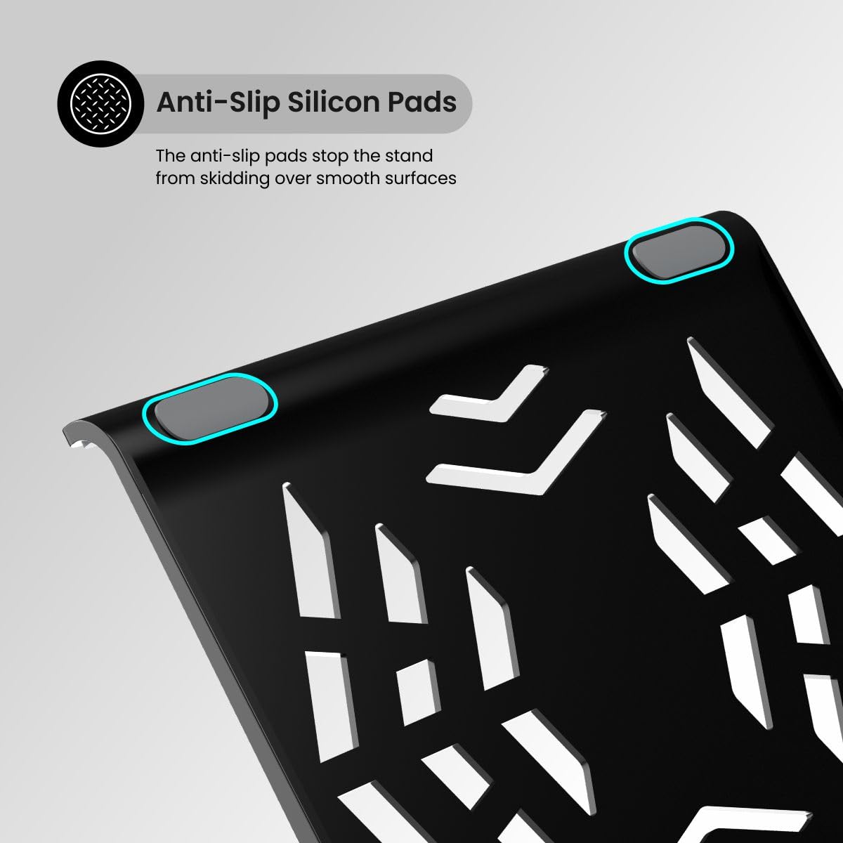 Anti-Slip Silicon Pads: Featuring anti-slip silicon pads, this stand securely holds notebooks, preventing them from sliding or scratching, ensuring stability and protection.