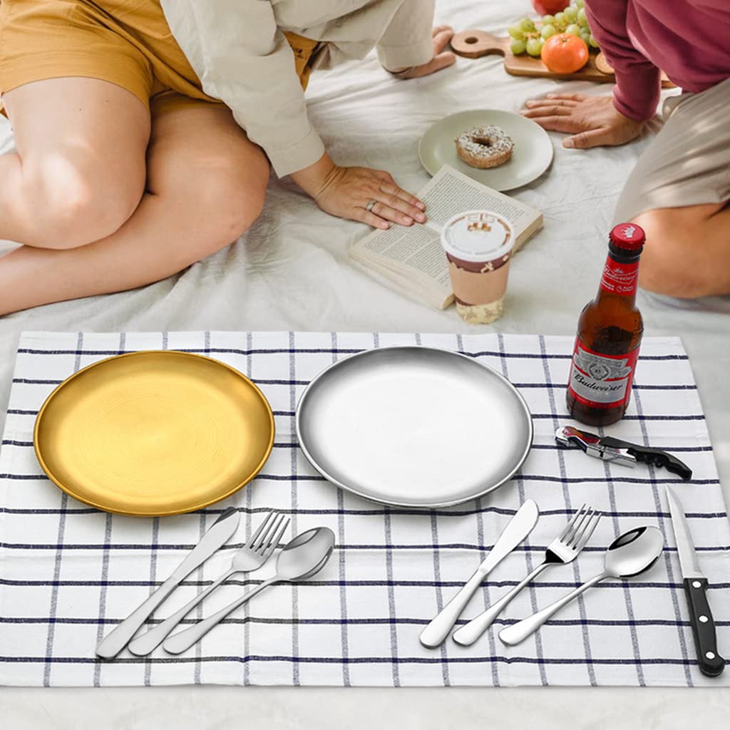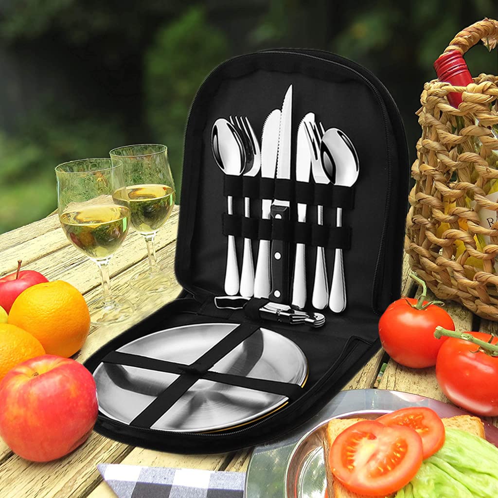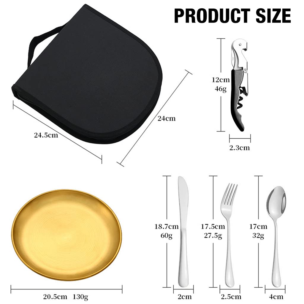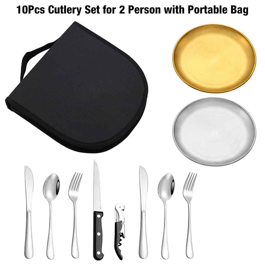 PREMIUM QUALITY: This 10pcs cutlery set are made of premium food grade stainless steel. Rust-resistant, sturdy and durable. This set includes 2 SS plates, 2 SS forks, 2 SS spoons, 2 SS cutters, 1 bottle opener and 1 butter knife.