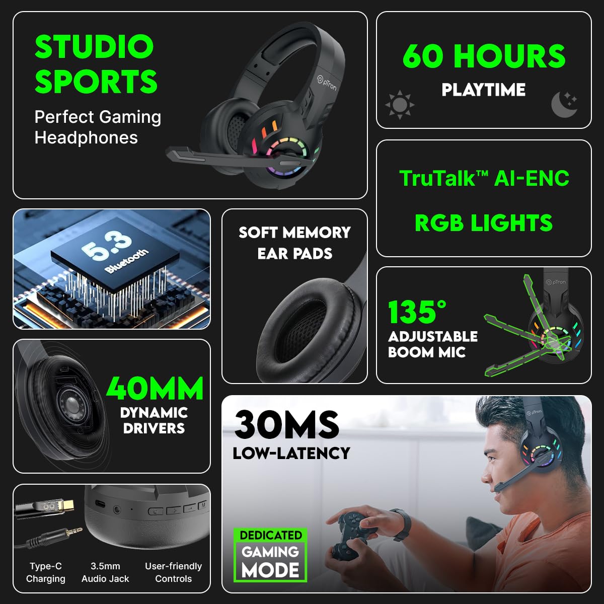 Be the first to review “pTron Studio Sports Wireless BT Gaming Over-Ear Headphones, 30MS Low-Latency for Thrilling Gaming Experience, RGB Lights, Boom HD Mic w/AI ENC, 60Hr Playtime, Punchy Sound, Type-C Fast Charging(Black)”