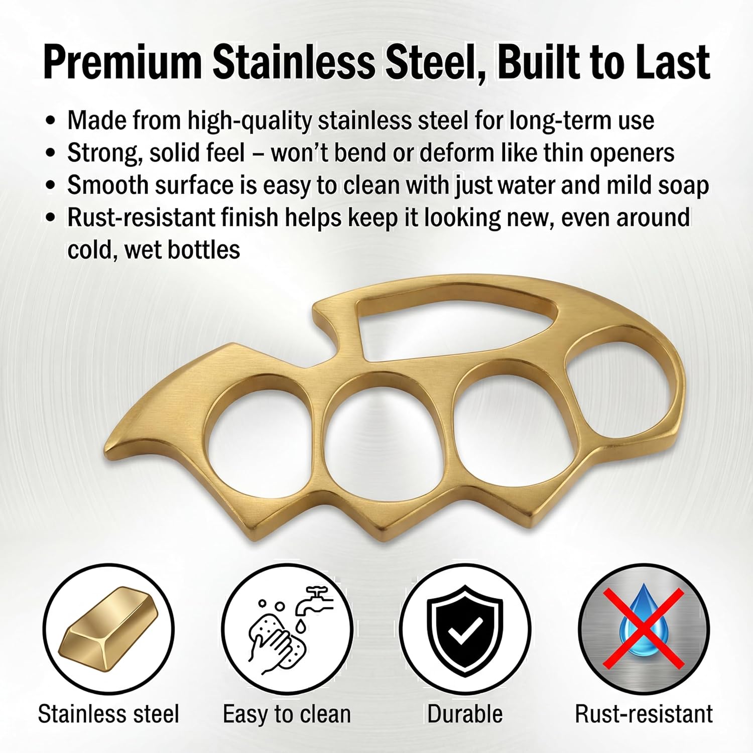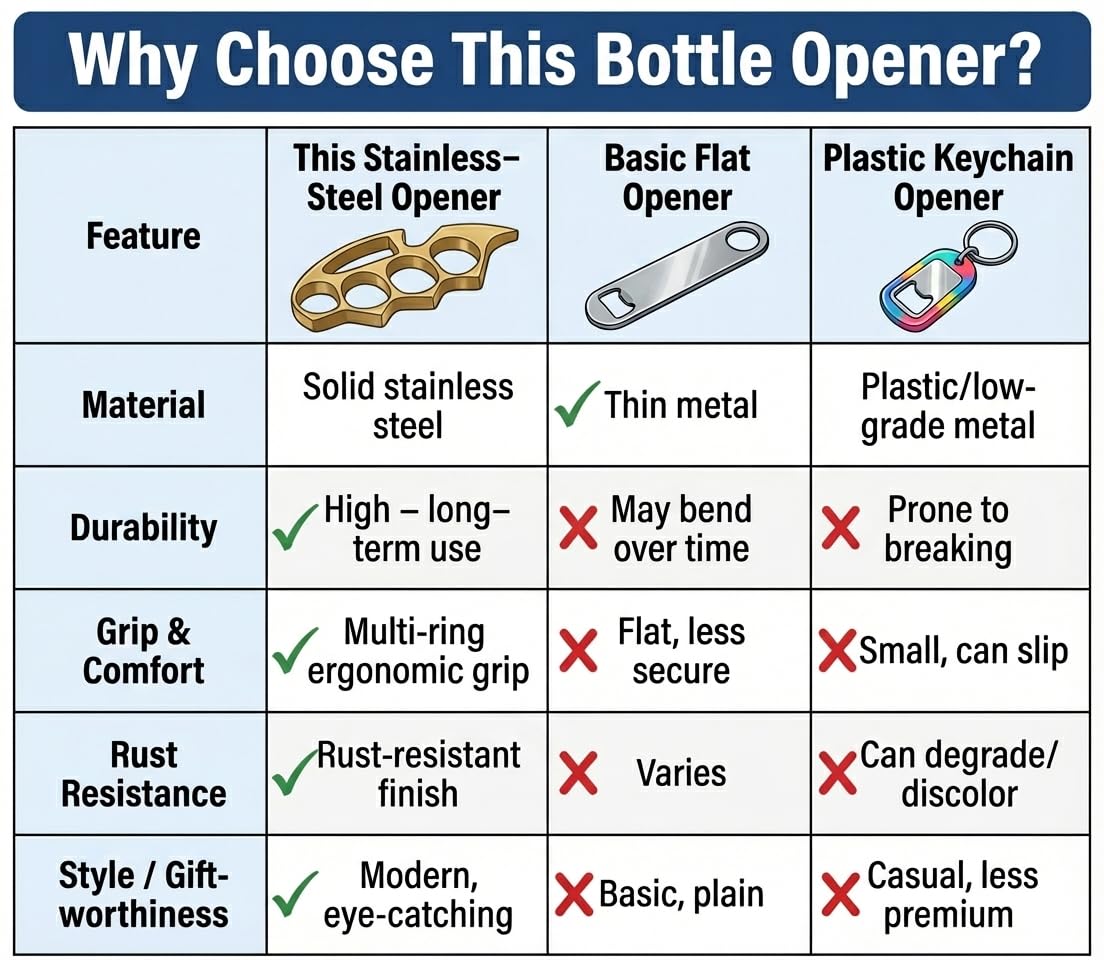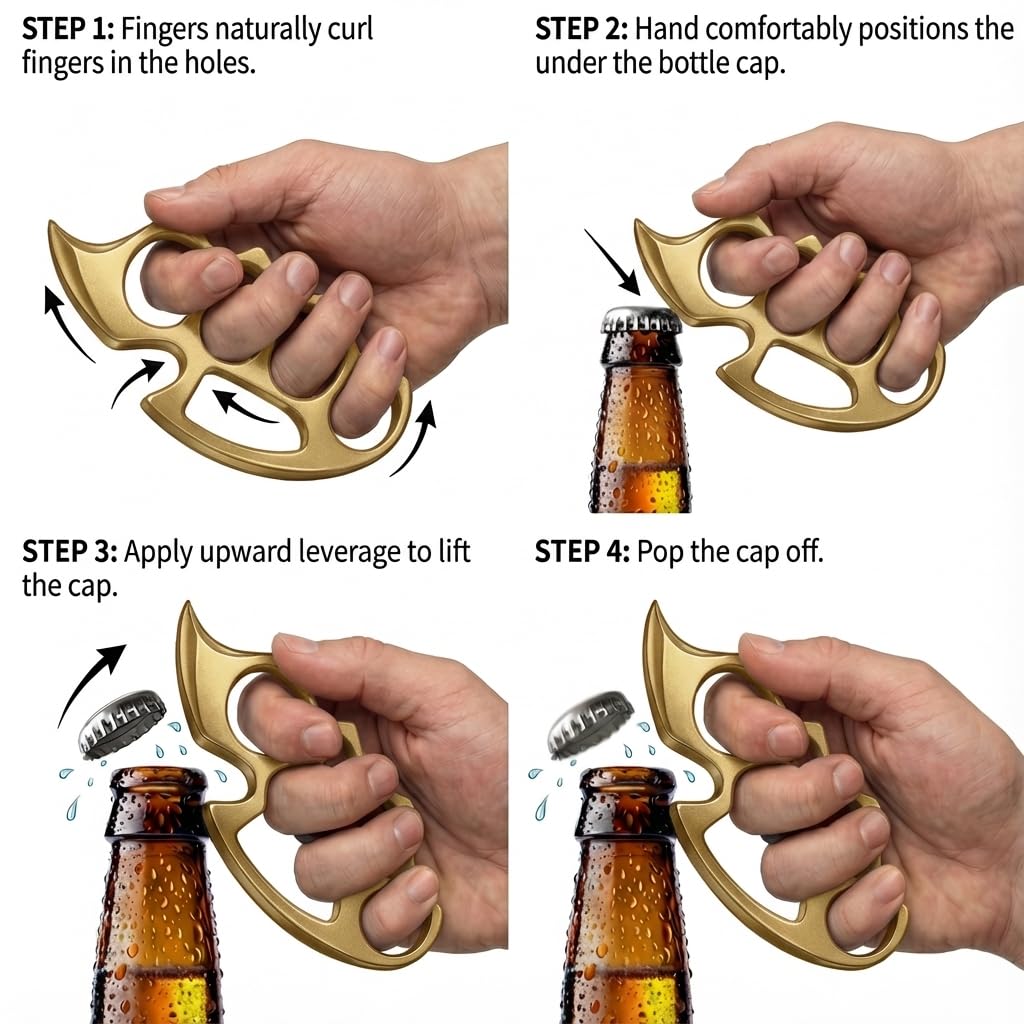 Ergonomic Four-Finger Grip: Unique ring-style handle gives strong leverage so you can pop caps in one smooth motion without hurting your hands, unlike flimsy can openers or cheap multitool keychains.