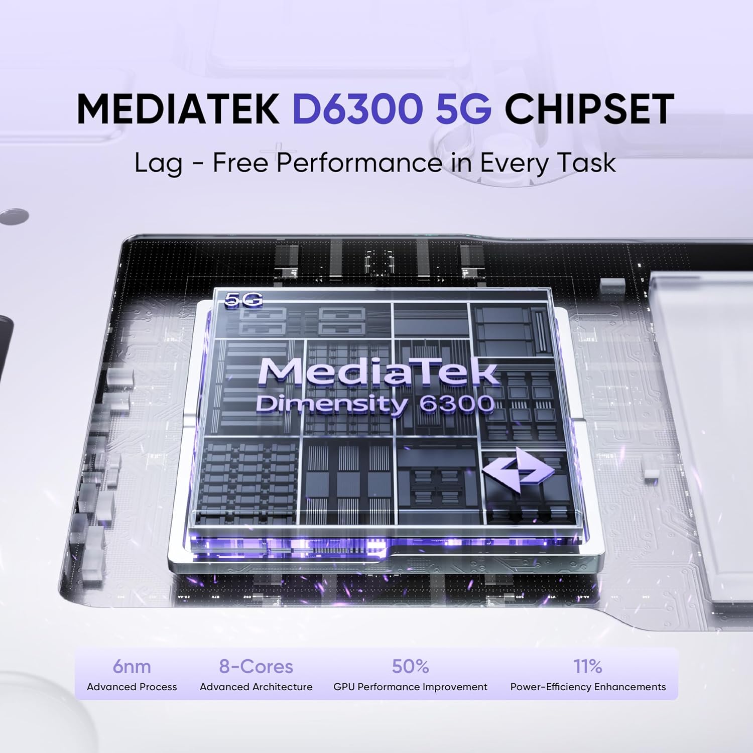 MediaTek Dimensity 6300 5G: Enjoy fast and reliable 5G connectivity with a power-efficient processor.
