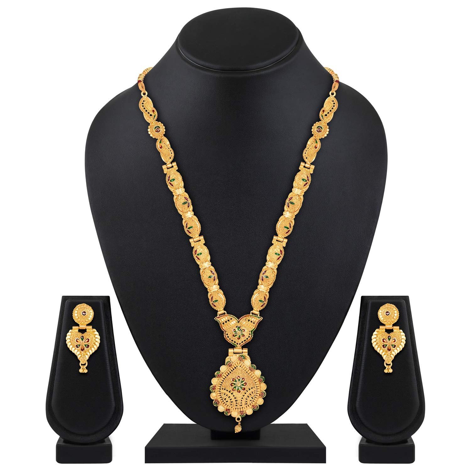 Shining Diva presents this latest design stylish one gram gold plated jewellery set long choker necklace set for women. This wedding party wear neckless jewelry set is made of high quality material which looks stylish and goes perfect with any attire. This necklace for girls is perfectly suited for wedding or party wear. Shining Diva has huge collection of latest statement pearl haram necklace, american diamond traditional gold plated necklace set, south indian type lakshmi temple pendant set, imitation peacock mayur neck choker and other jewellery accessories. Buy Shining Diva trendy artificial jewellery from Amazon in offer. These are also ideal for special birthday gifts for girls, wife, love valentine gifts for girlfriend, wedding gifts and anniversary gifts.