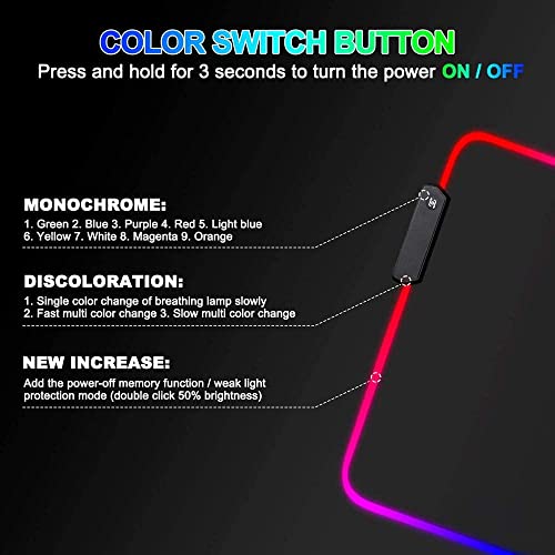 EASY TO INSTALL: Comprised of tremendous colourful luminescent fiber, gaming mouse pad LED is powered by USB and requires no driver. One management buttons make it simple to modify between backlight modes which might even be turned off. RGB lighting gives a particular feeling and fervour while you play video games.