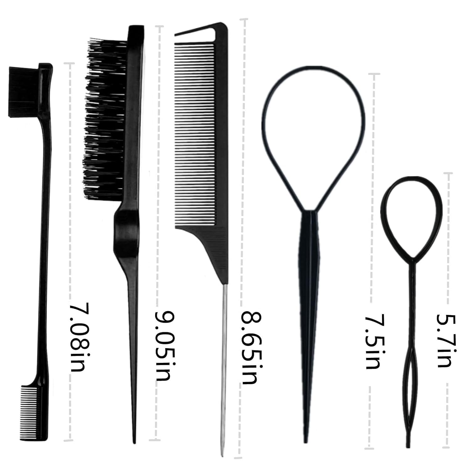 Package Included: 5 pieces of hair edge brush and comb sets. Double sided edge brush(6.9″) , bristle brush(8.7”) and pin tail comb(9.2”), 2pcs Topsy Hir tail tool