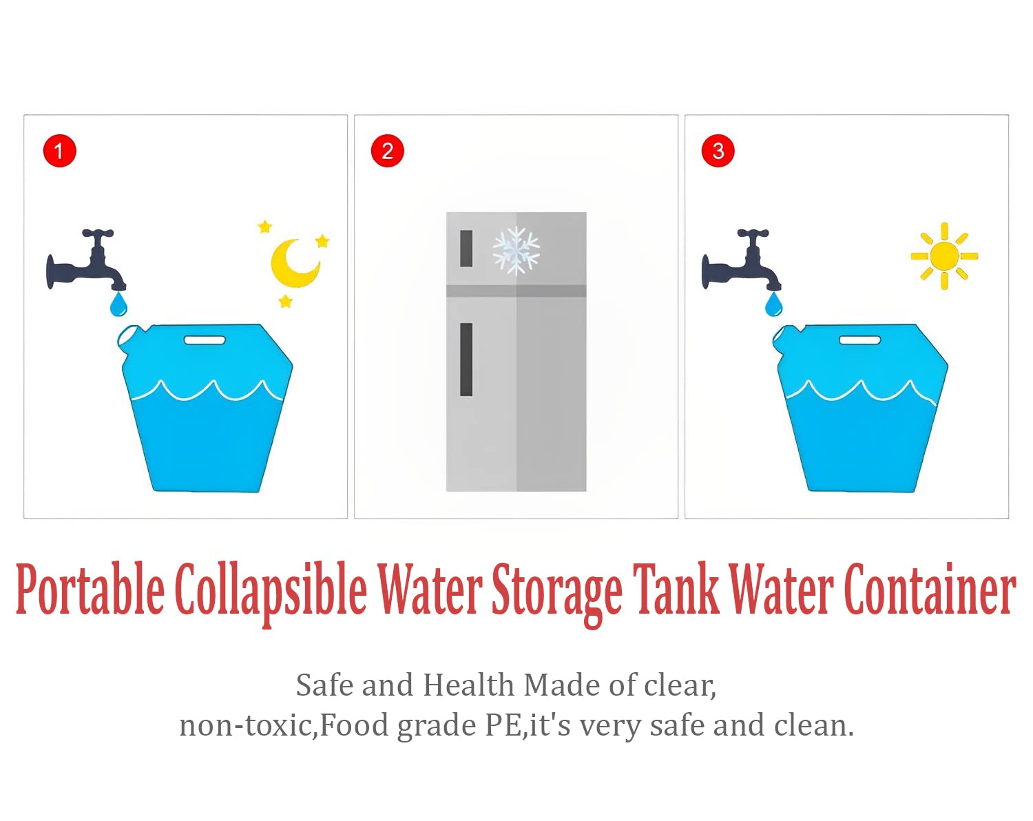 These water containers are made of high-quality food-grade PE material which is safe and non-toxic, odorless and tasteless when filled, rinsed with lukewarm water, easy to clean. The screw cap above keeps the water bag airtight and provides a leakproof seal. Take up little room in your pack, ultra light-weight. It can hold plenty of water, perfect for backpacking and family camping trip. Perfect for survival kits, camping, hiking, backpacking, hunting, BBQ, travel, RV, sports events, car emergency.