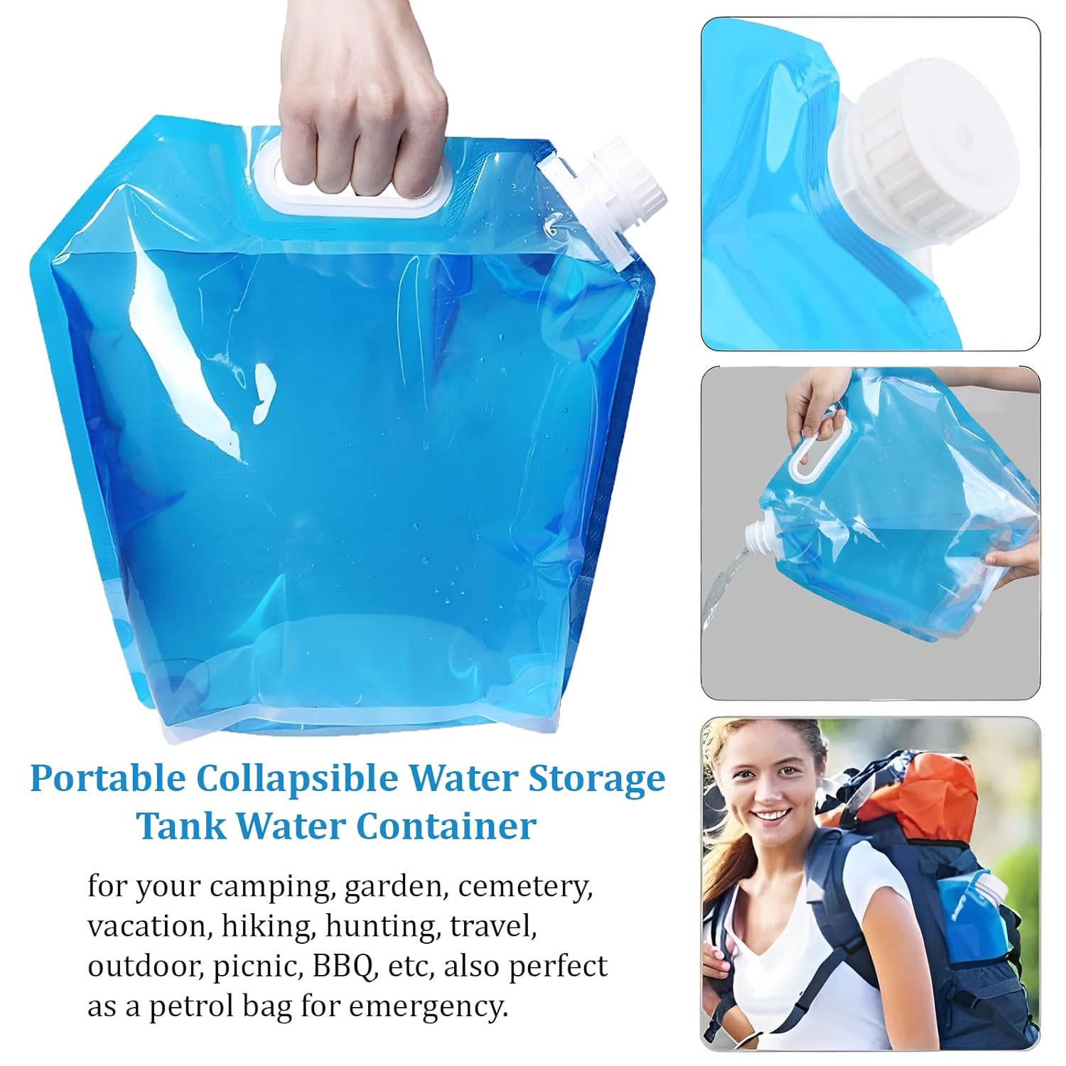 Wide applicatuon: Portable water tank is a movable water tank, ideal for water and other drinks storage for your camping, garden, cemetery, vacation, hiking, hunting, travel, outdoor, picnic, BBQ, etc, also perfect as a petrol bag for emergency