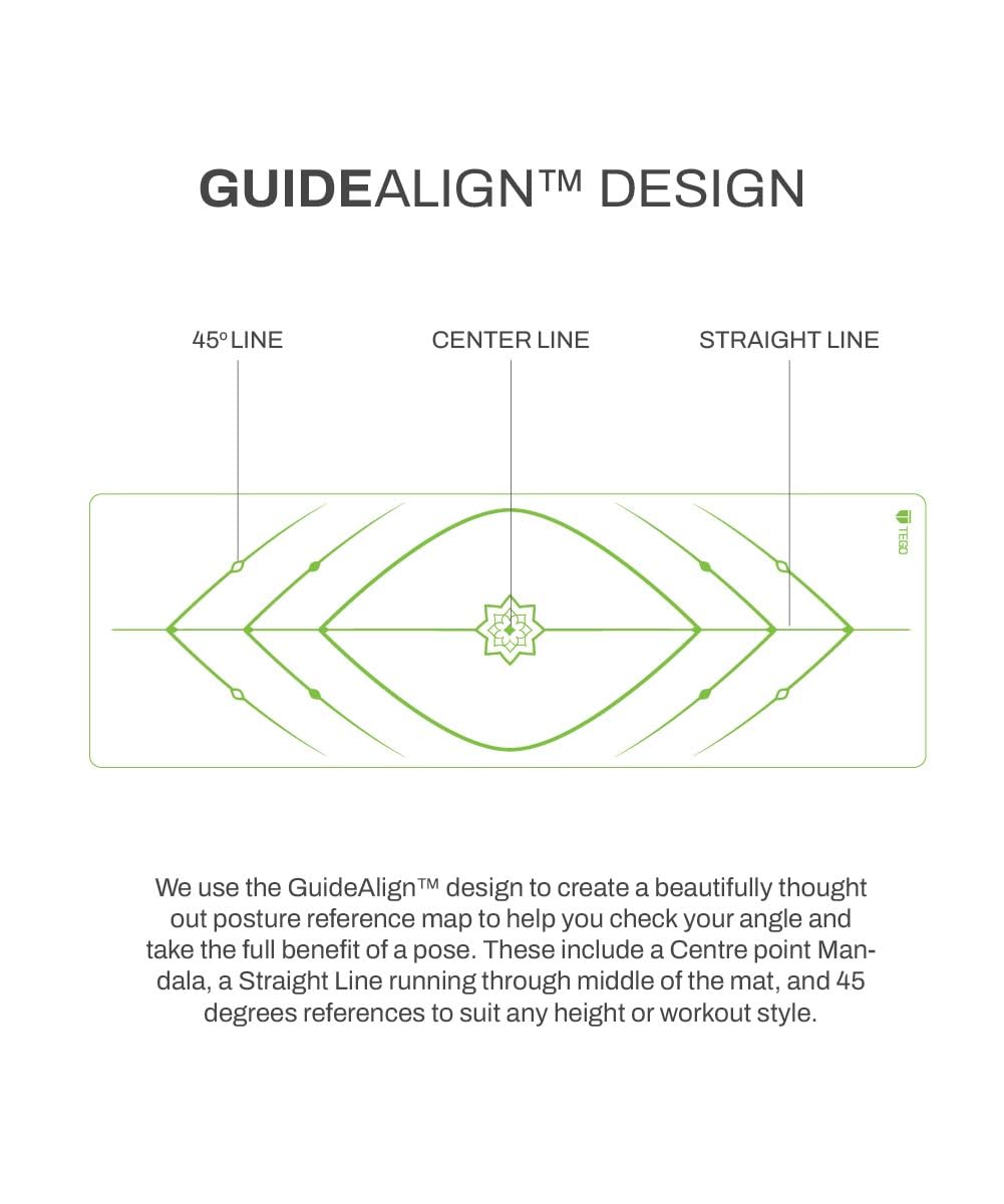Guidealign Posture Map For Perfect Alignment Practice with confidence using Tego’s proprietary GuideAlign system – featuring a center mandala, straight center line, and 45° angles for accurate positioning across for all heights and workout styles.