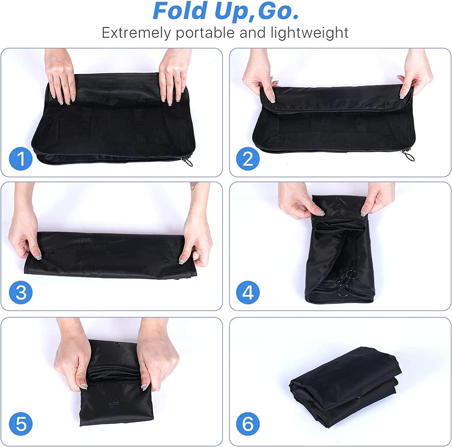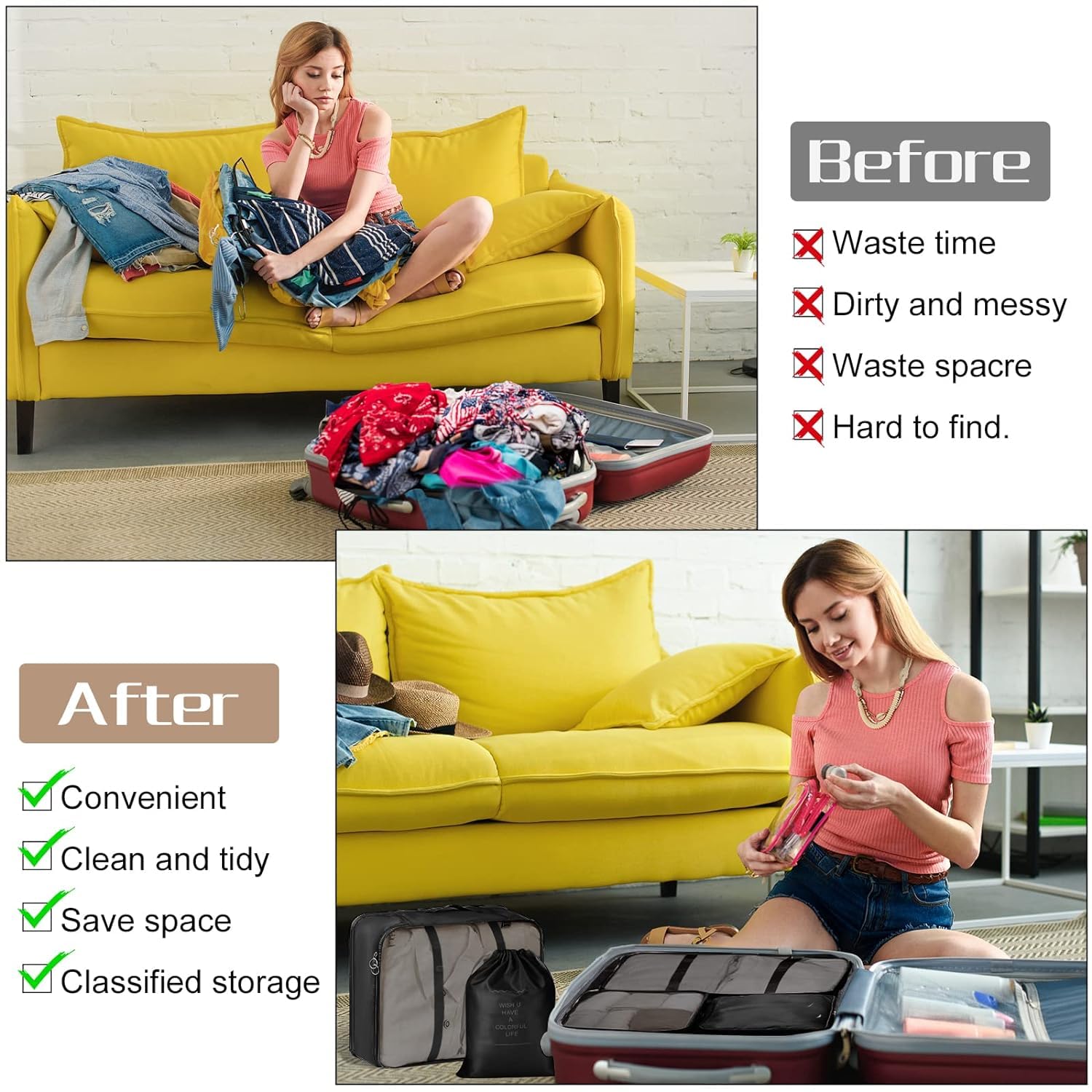 Packing Cube Set Details : 7 pcs packing organizers set ( 3 different size clothes storage bags or cubes + 3 laundry pouches which can also be used as 1 bra/underwear bag , 1 cosmetics bag , 1 toiletry bag + 1 bonus drawstring shoe bag). The 3-laundry pouch can be used for your used clothes while the compression garment bag can be used for footwears.