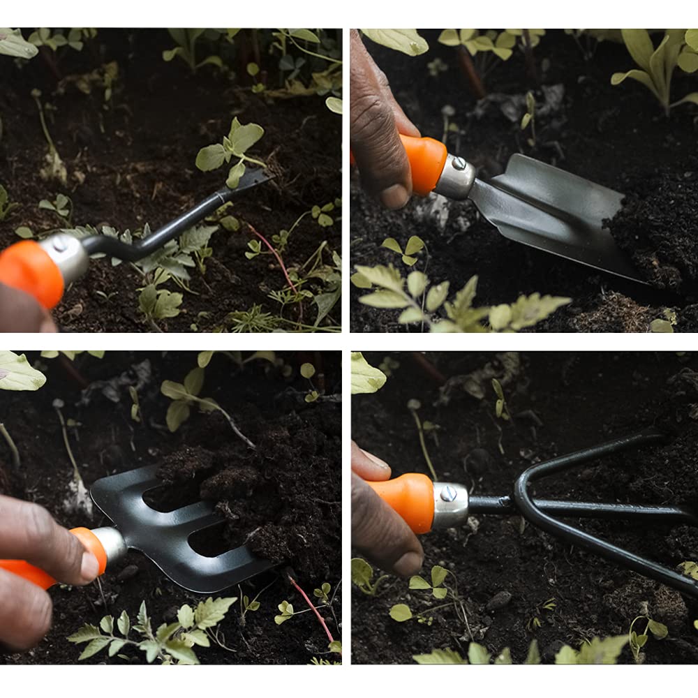 Ergonomic and Durable Garden Tools: Crafted with strong metal heads and comfortable orange handles, these gardening tools offer durability and ease of use. The ergonomic design minimizes hand fatigue during extended use, making this gardening tools kit practical and reliable for daily gardening tasks.