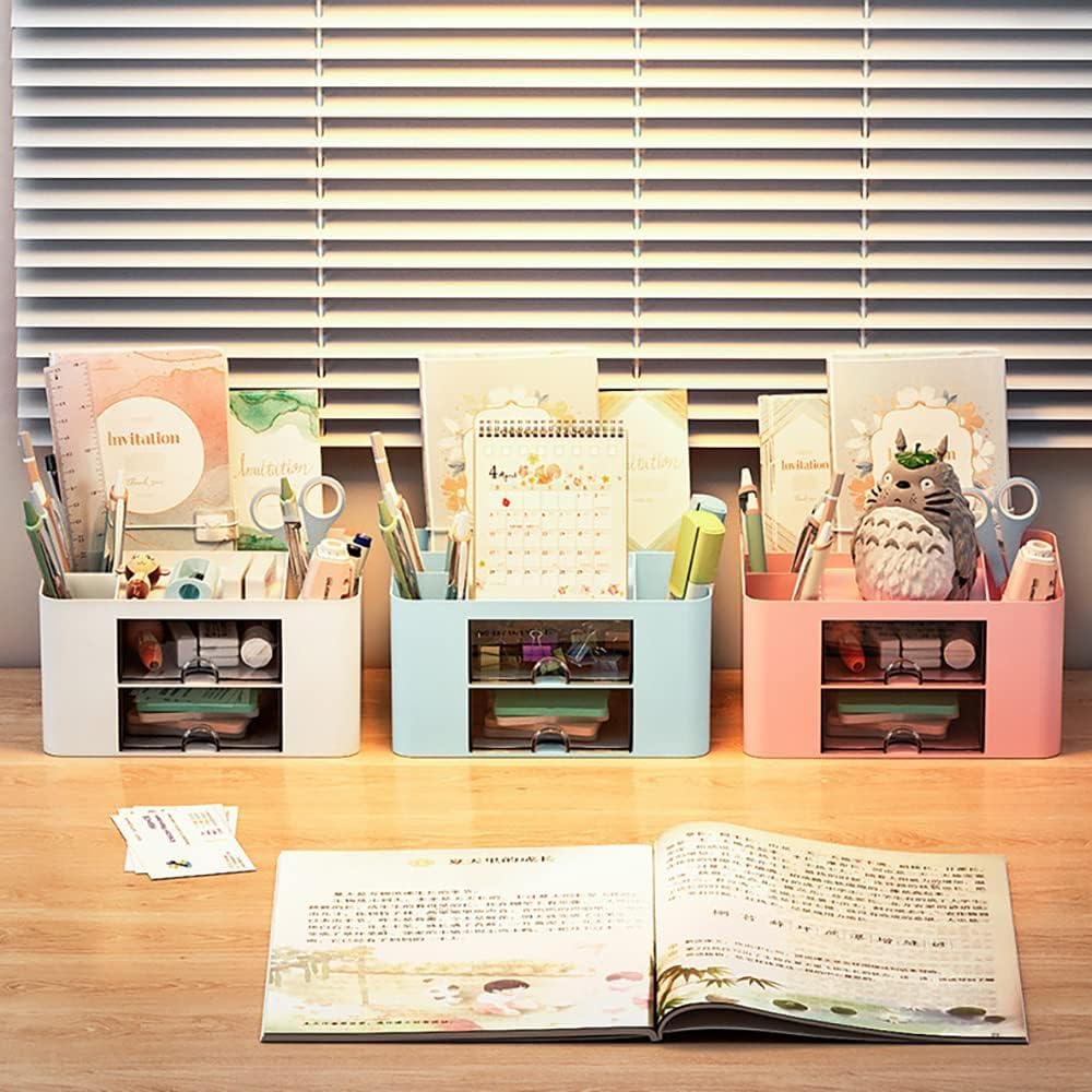 7 Compartment Pencil Holder: The top of the storage box is divided into 5 compartments, suitable for pens, pencil, ballpoint pen, rulers, erasers, sharpener, stapler, washi tape, binder clip and mini notebook. And the 2 small drawers at the bottom can hold some small items.