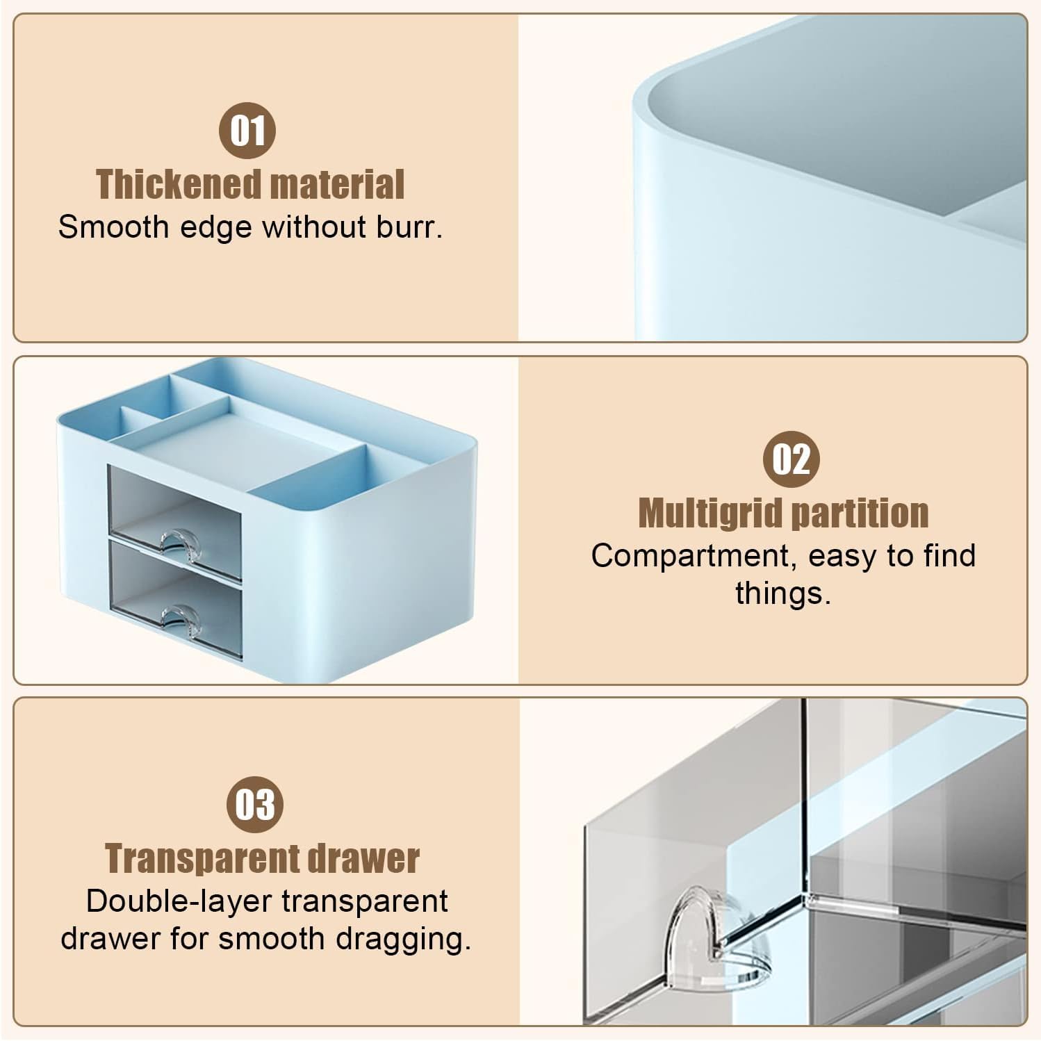 High Quality Material : The Desk Organizer are made of durable plastic, odorless and non-toxic, and can be used for a long time. The surface of the pen shelf is smooth and burr-free, safe for children. Desk organizer easy to clean, Rinse the drawer organizer kitchen with water when stains or simply wipe with a damp cloth.