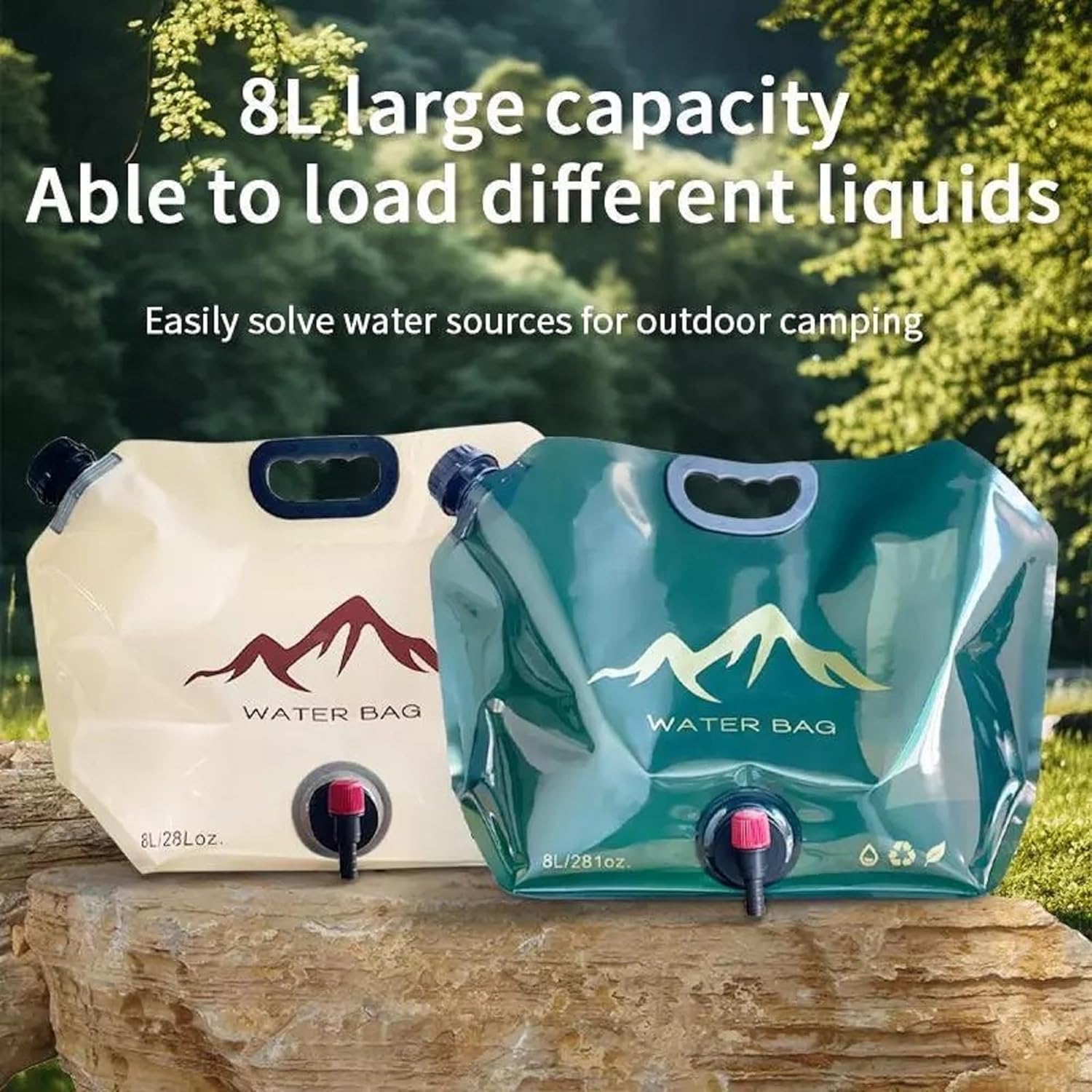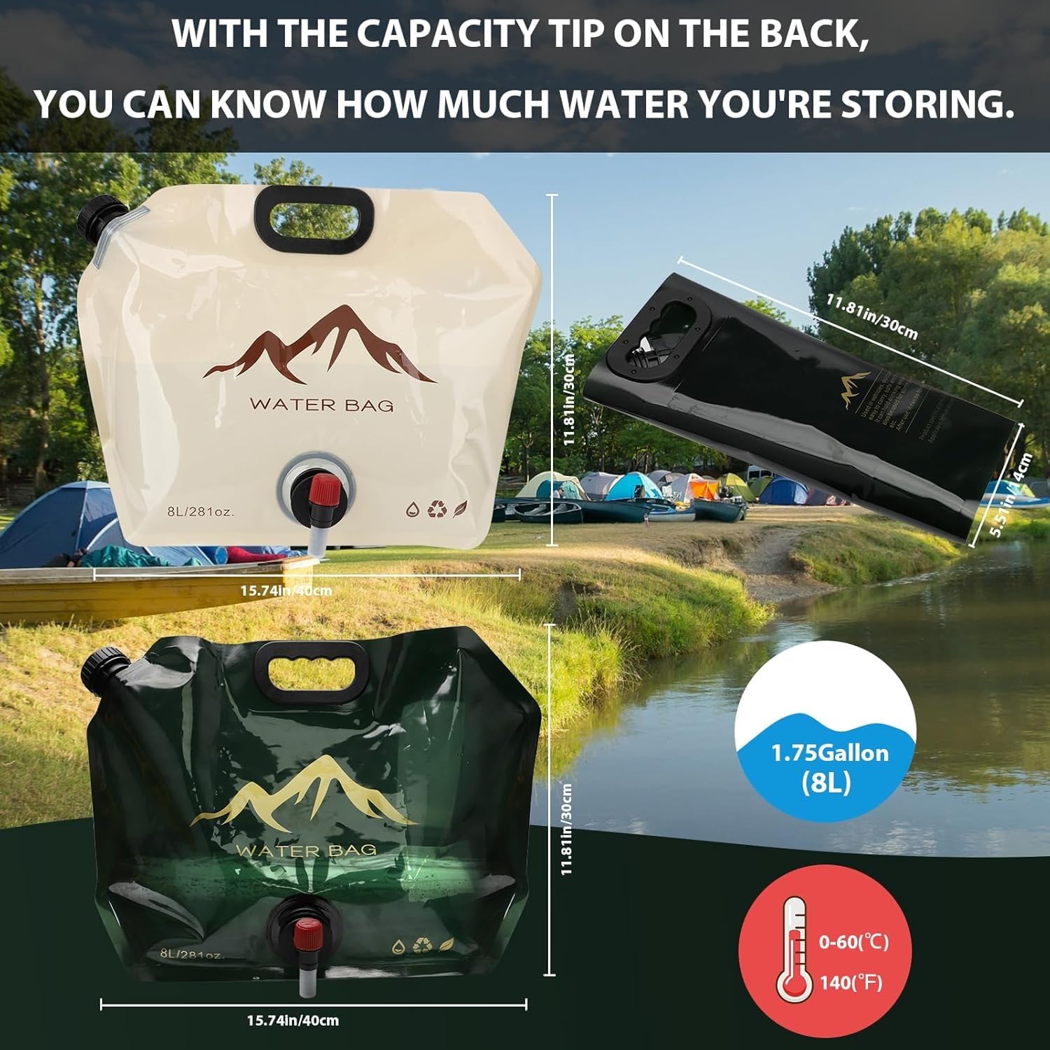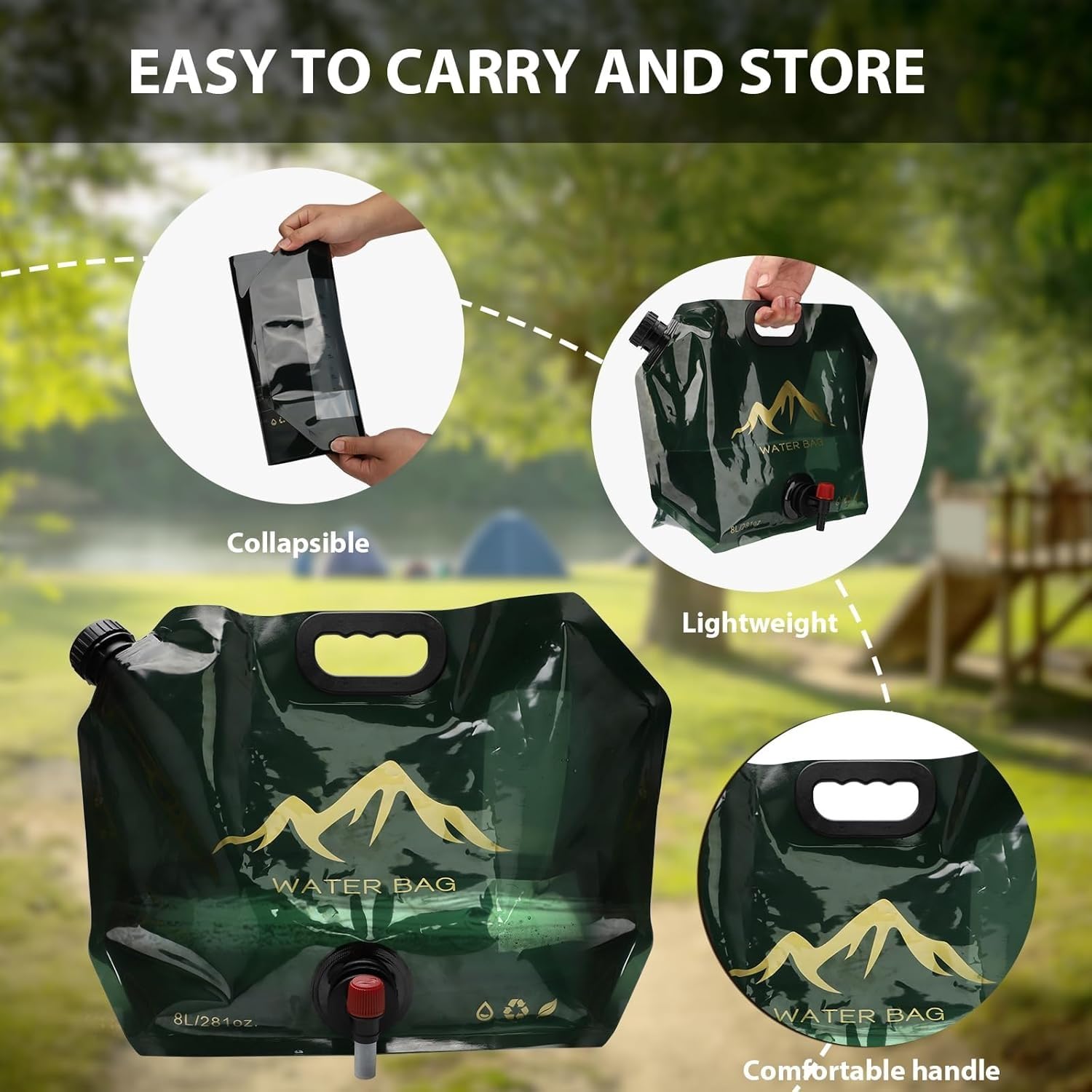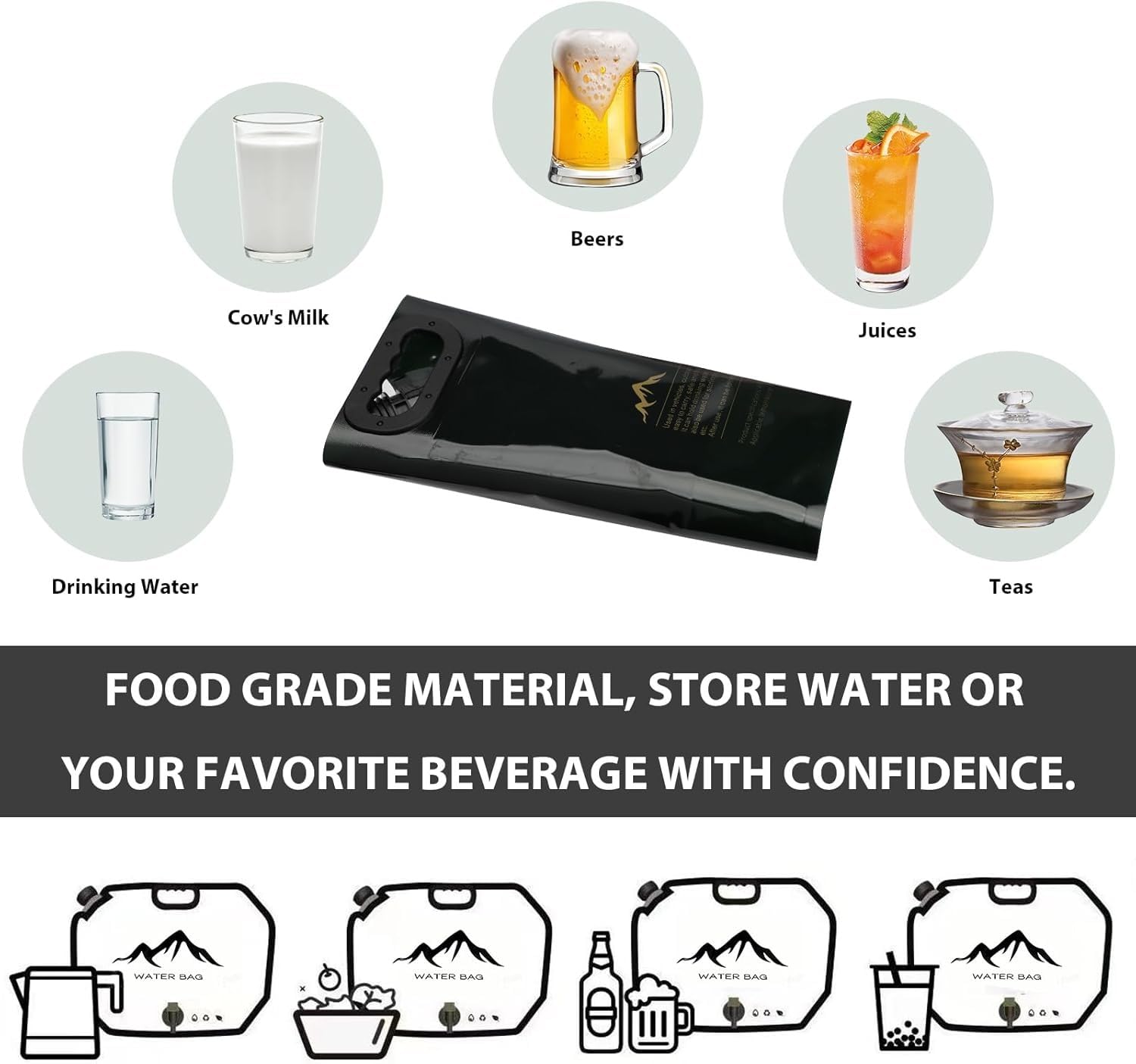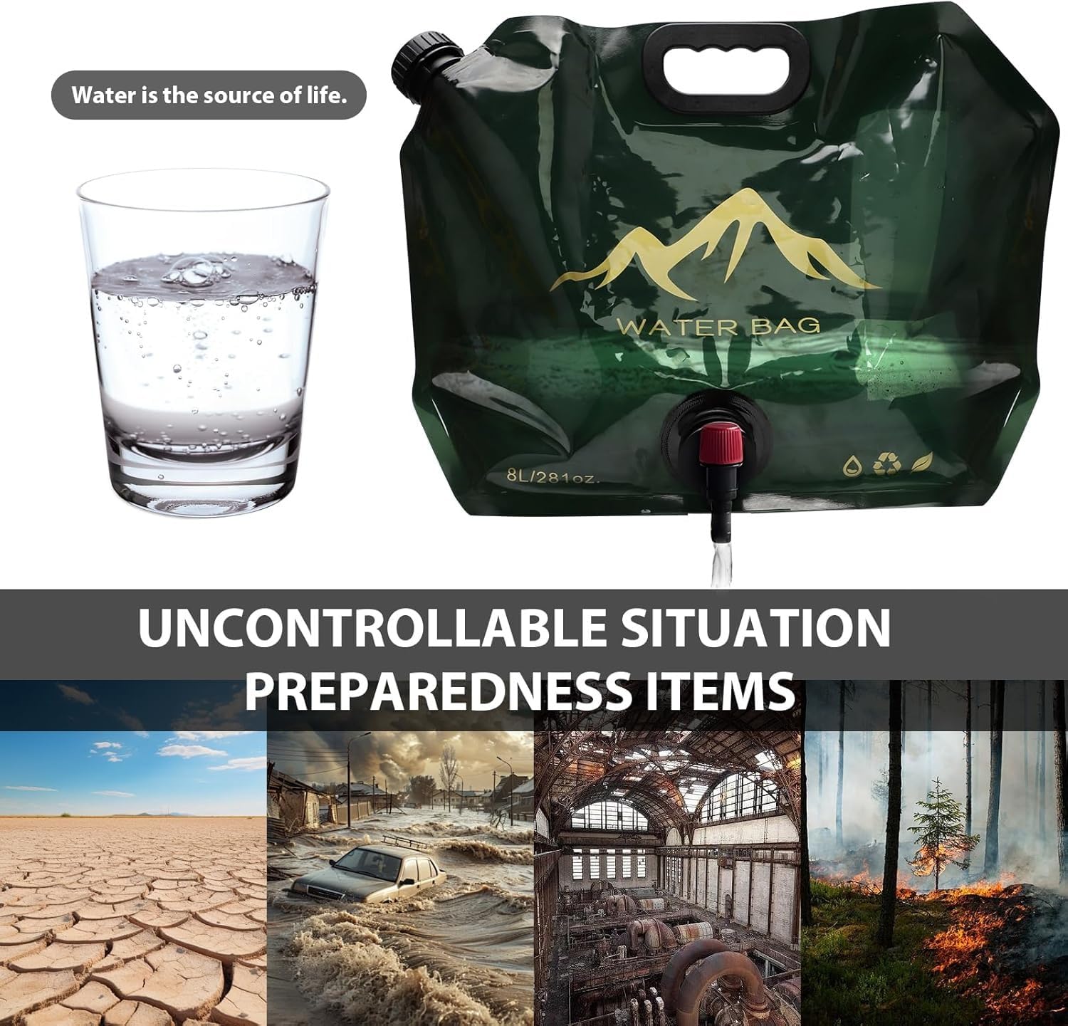 Food Grade: This 8 Liter Collapsible Emergency Water Storage Bag with Tap water container is made of food grade pet plastic, no bpa pvc or dehp, no plastic pvc odor and water taste will not be affected