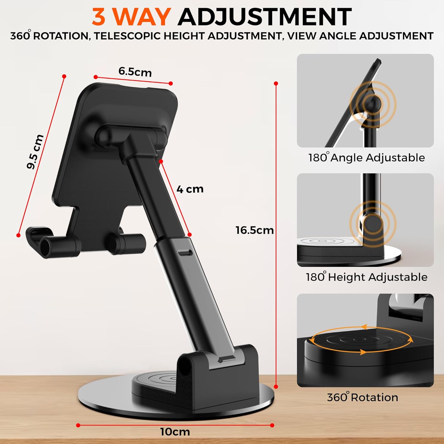 Anti-slip pad: The Phone holder for table has an anti-slip pad which works perfect to keep your devices in place while in use and prevent from daily scratches and sliding