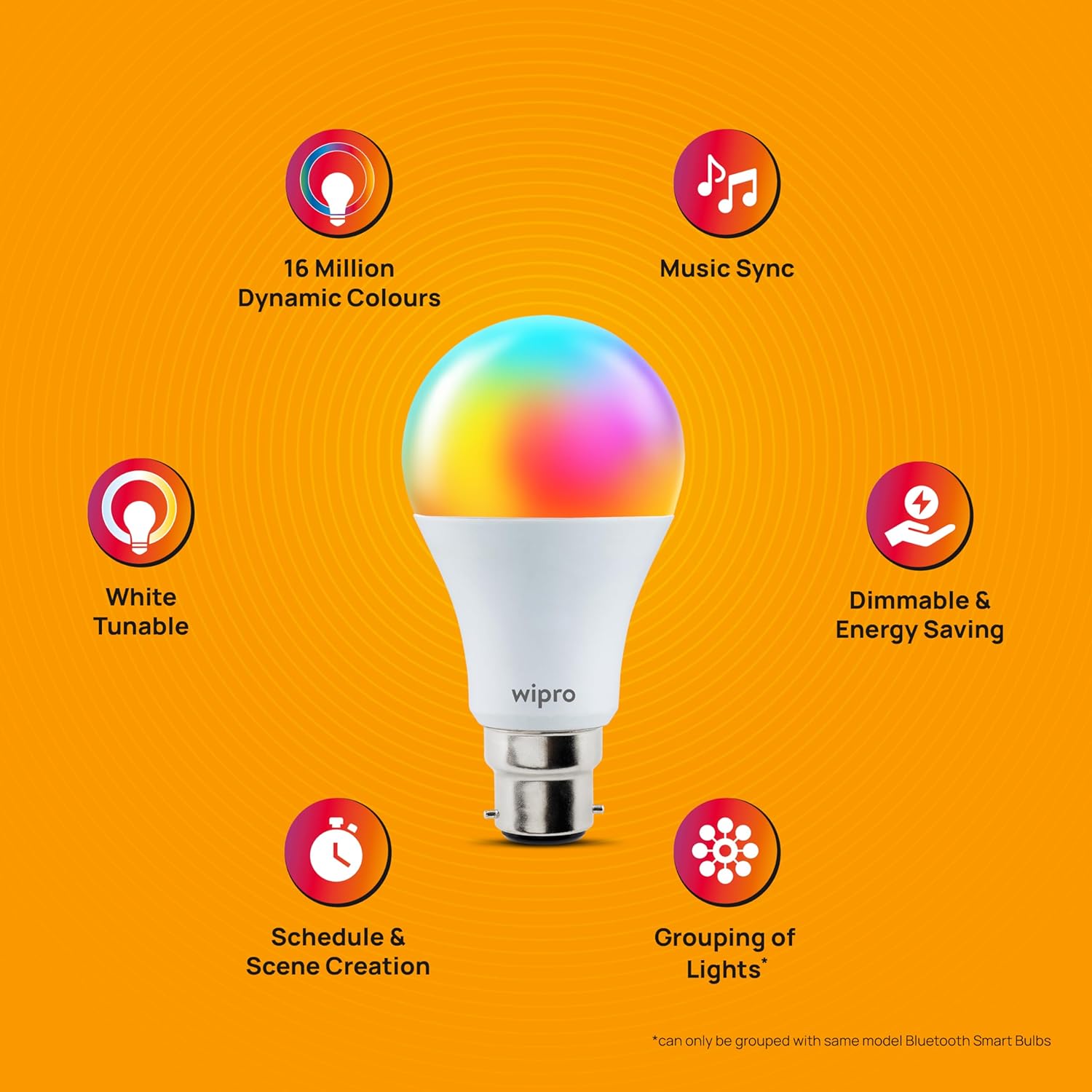 wipro 9W Bluetooth Enabled Smart Bulb B22 | 16 million Colours | White Tunable (Warm, Neutral & Cool White) | Dimmable | App-Control | Music Sync | Schedule & Scenes | Pack of 1