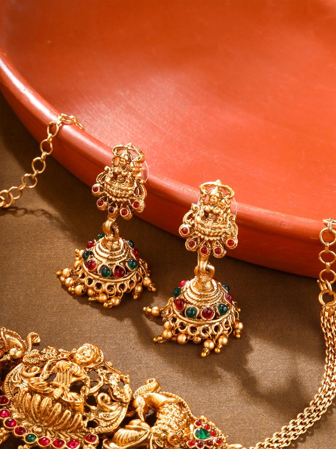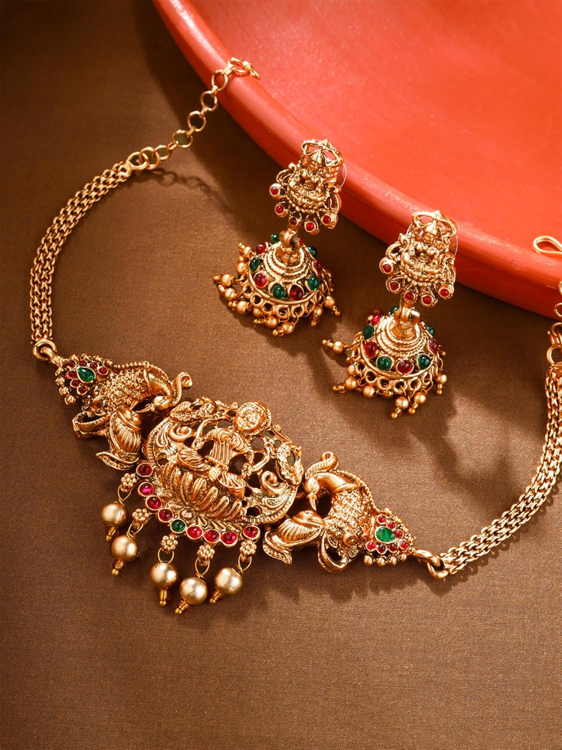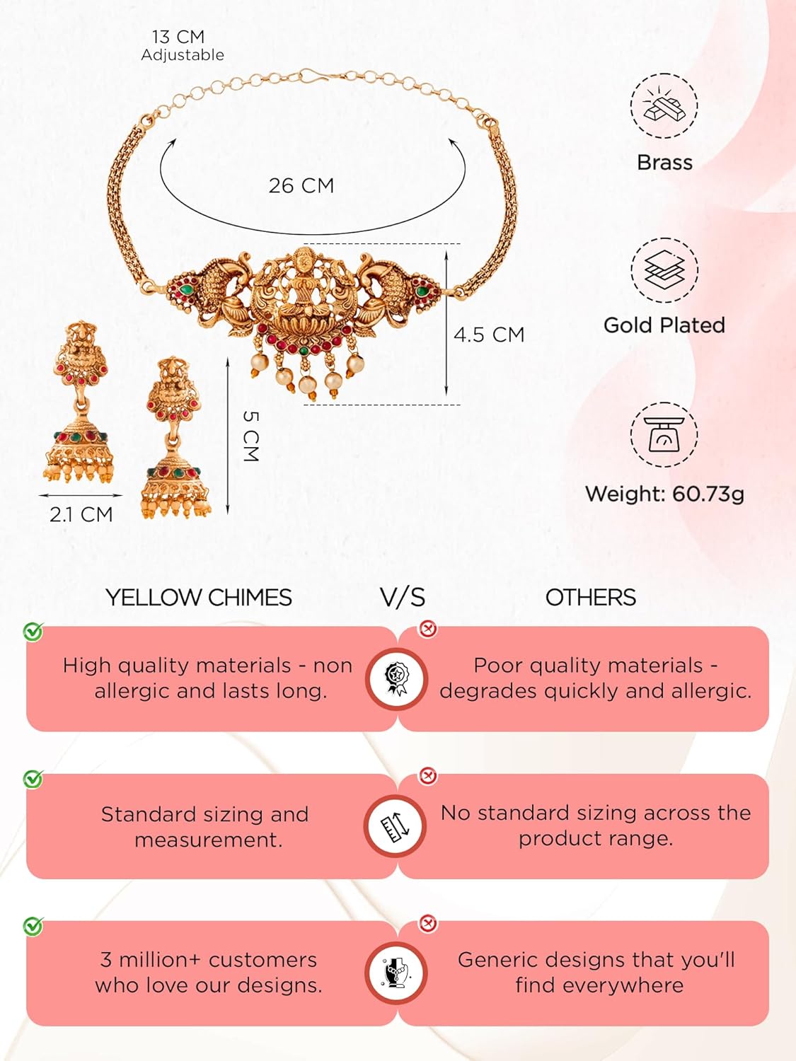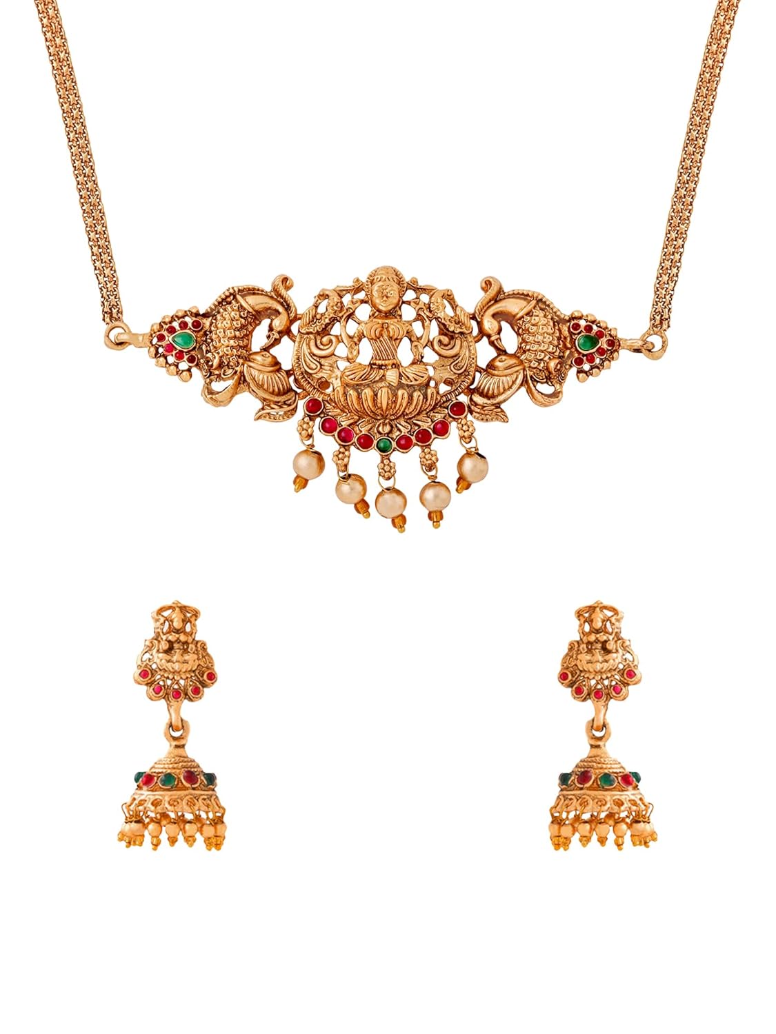 Looking for the perfect gift for a special woman in your life? Look no further than the Yellow Chimes women jewellery set. Crafted with high-quality brass and adorned with classic temple lakshmi designs, this set is sure to impress. The intricate craftsmanship and semi-precious stones add a touch of elegance to any outfit. Packaged in an elegant Yellow Chimes box, this jewellery set is perfect for occasions like weddings, Valentine’s Day, anniversaries, or simply as a thoughtful gift for a friend, daughter, or mother. Pair it with a saree or any traditional attire for a wedding event or to attend any festivities. The set includes a choker necklace that is perfect for themed functions and occasions. The temple jewellery set is handcrafted to perfection, ensuring that each piece is unique. The gold-plated finish adds a touch of glamour, while the smooth link chain with an S hook clasp ensures a secure fit. The set is designed to be durable and long-lasting, so you can enjoy it for years to come.People love the beautiful and attractive design of this jewellery set, as well as its impressive quality. The set is budget-friendly and offers great value for money, making it a must-have addition to any jewellery collection. Don’t worry about poor quality or detachable parts – the Yellow Chimes women jewellery set is designed to last. With careful attention to detail and high-quality materials, this set is sure to exceed your expectations. Elevate your look with this stunning jewellery set from Yellow Chimes.