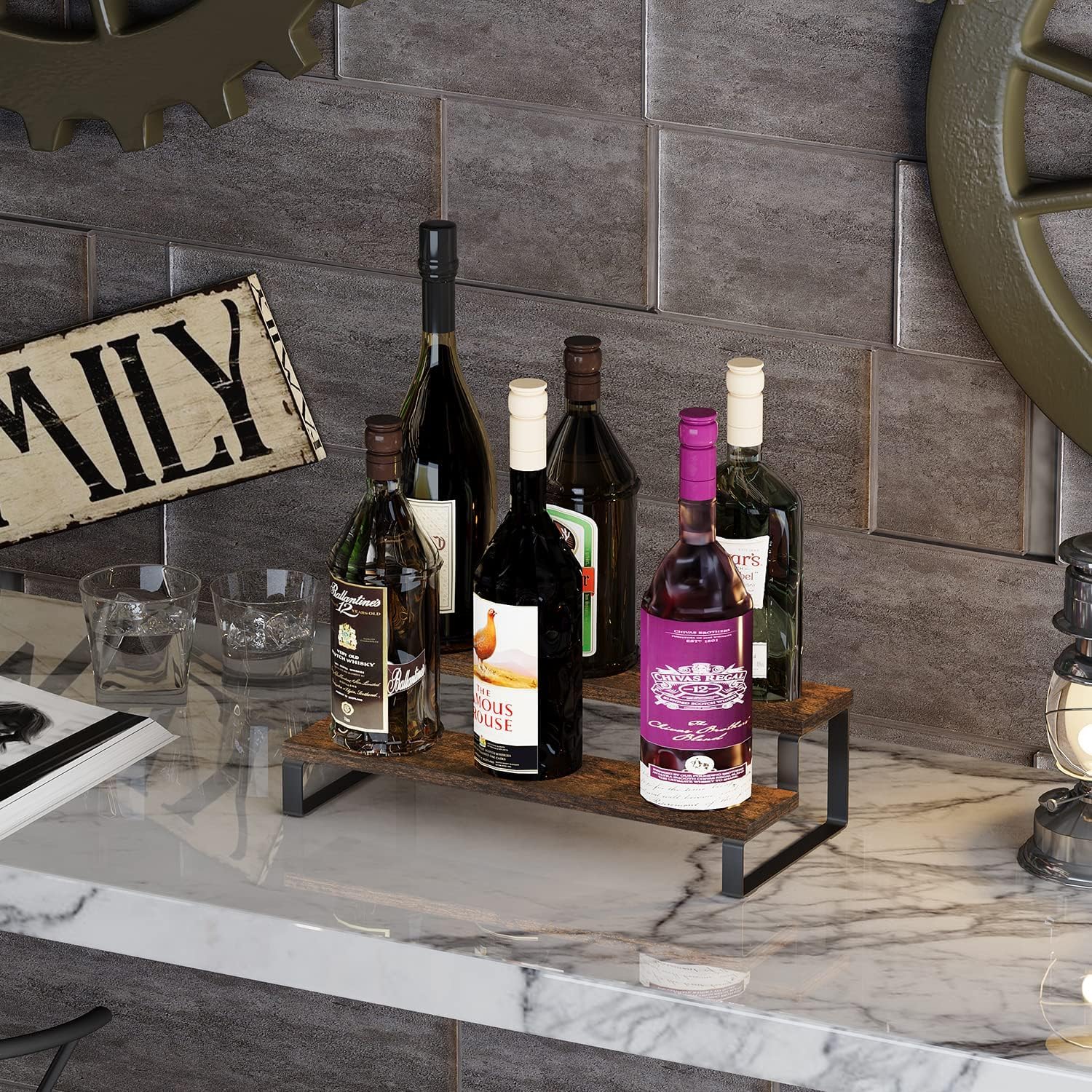 STURDY CONSTRUCTION: Robust metal frame with industrial-style finish supports heavy bottles and jars without wobbling