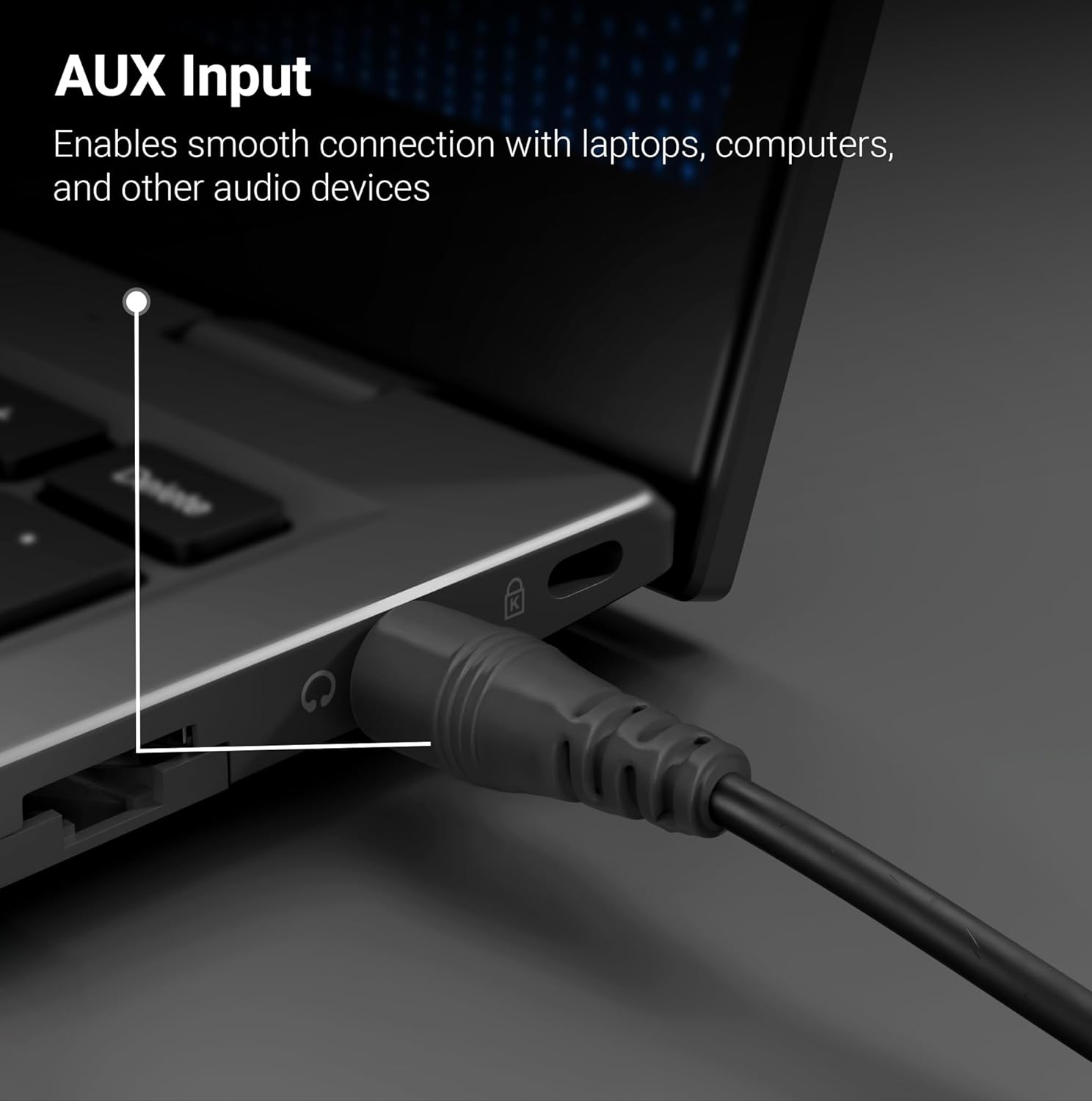 AUX input: The speaker’s AUX input ensures effortless connectivity with computers, laptops, and other audio sources.