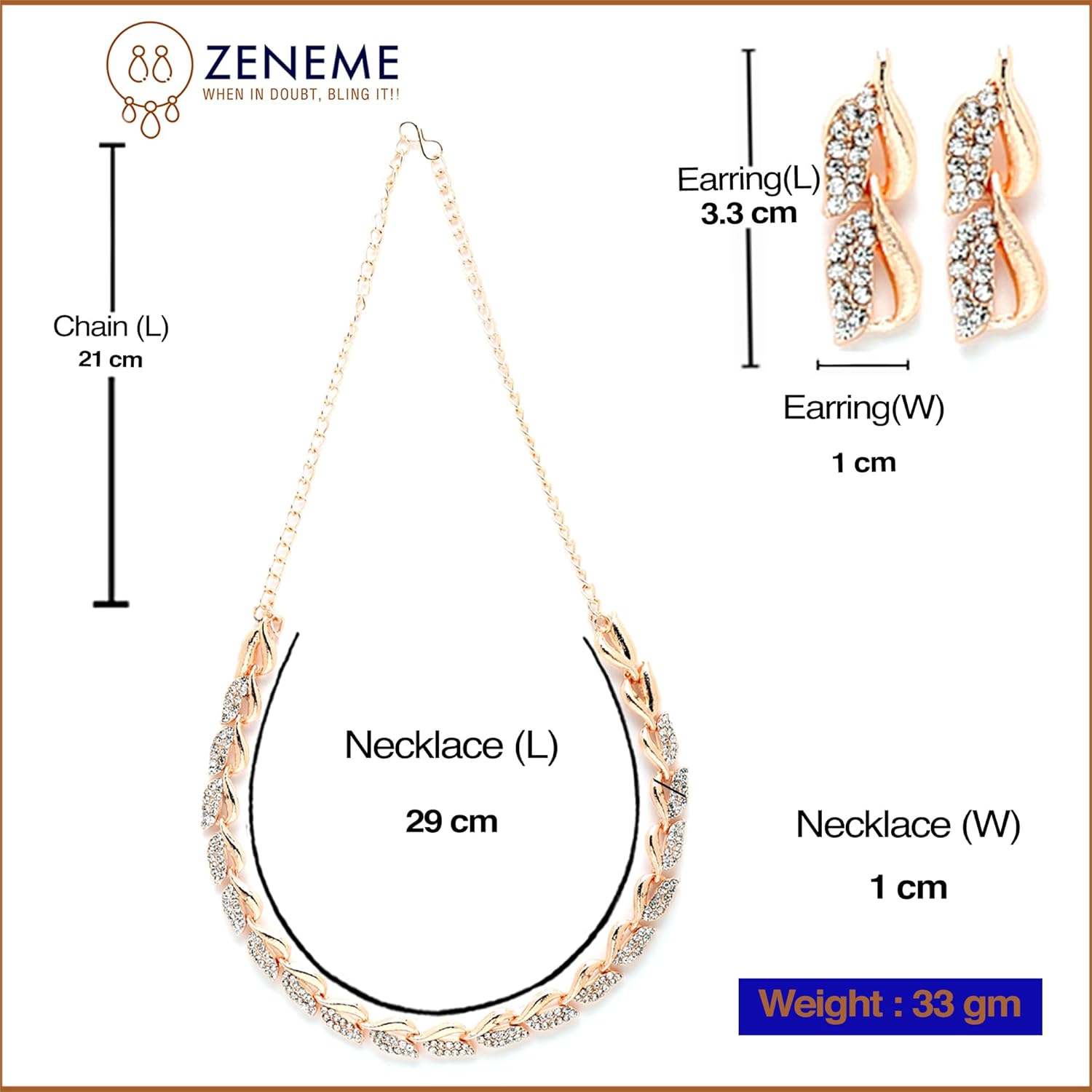 ZENEME Women American Diamond Studded Intrcately Designed Leaf Shaped Necklace With Earring Jewellery Set For Women and Girl