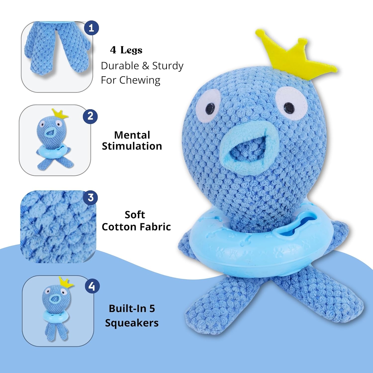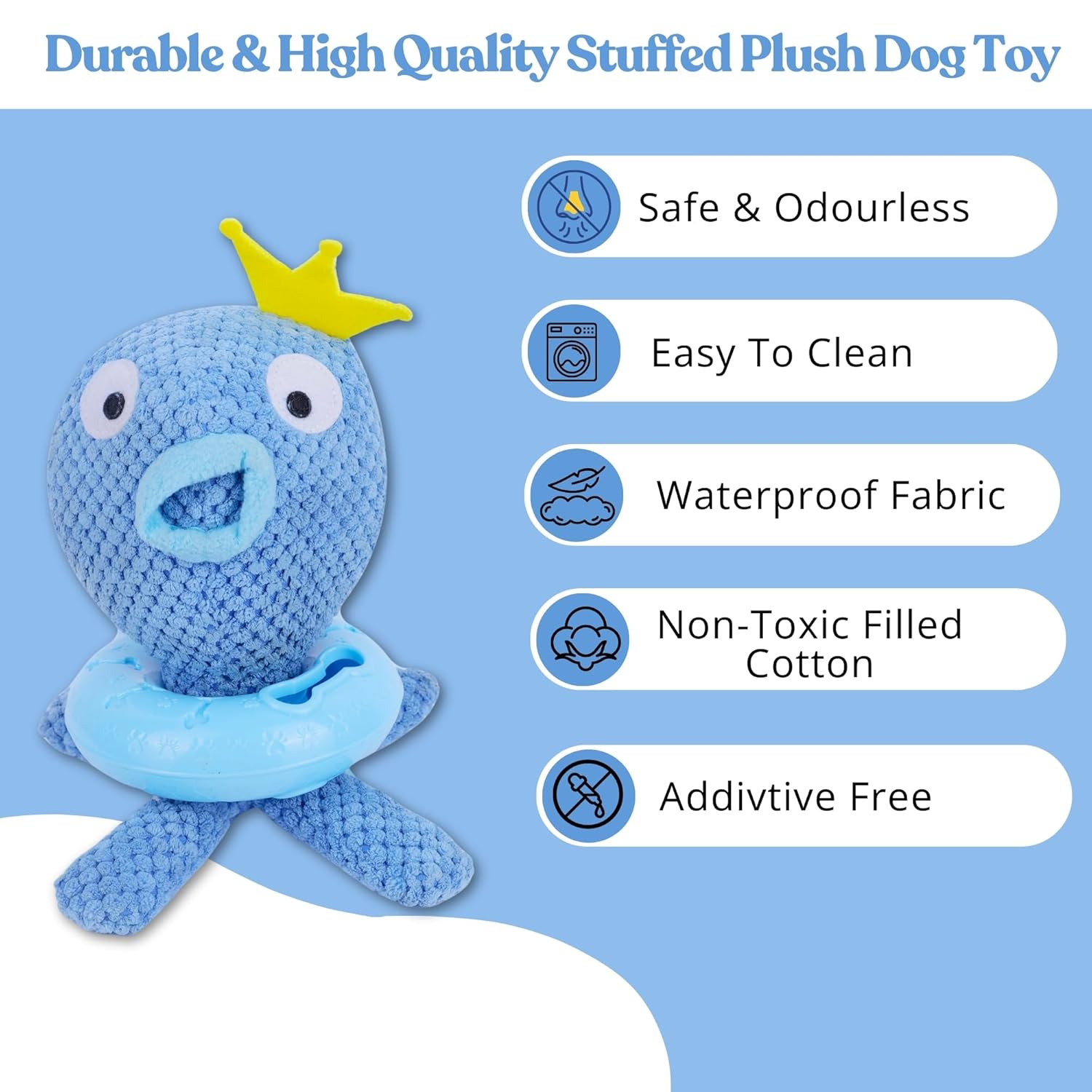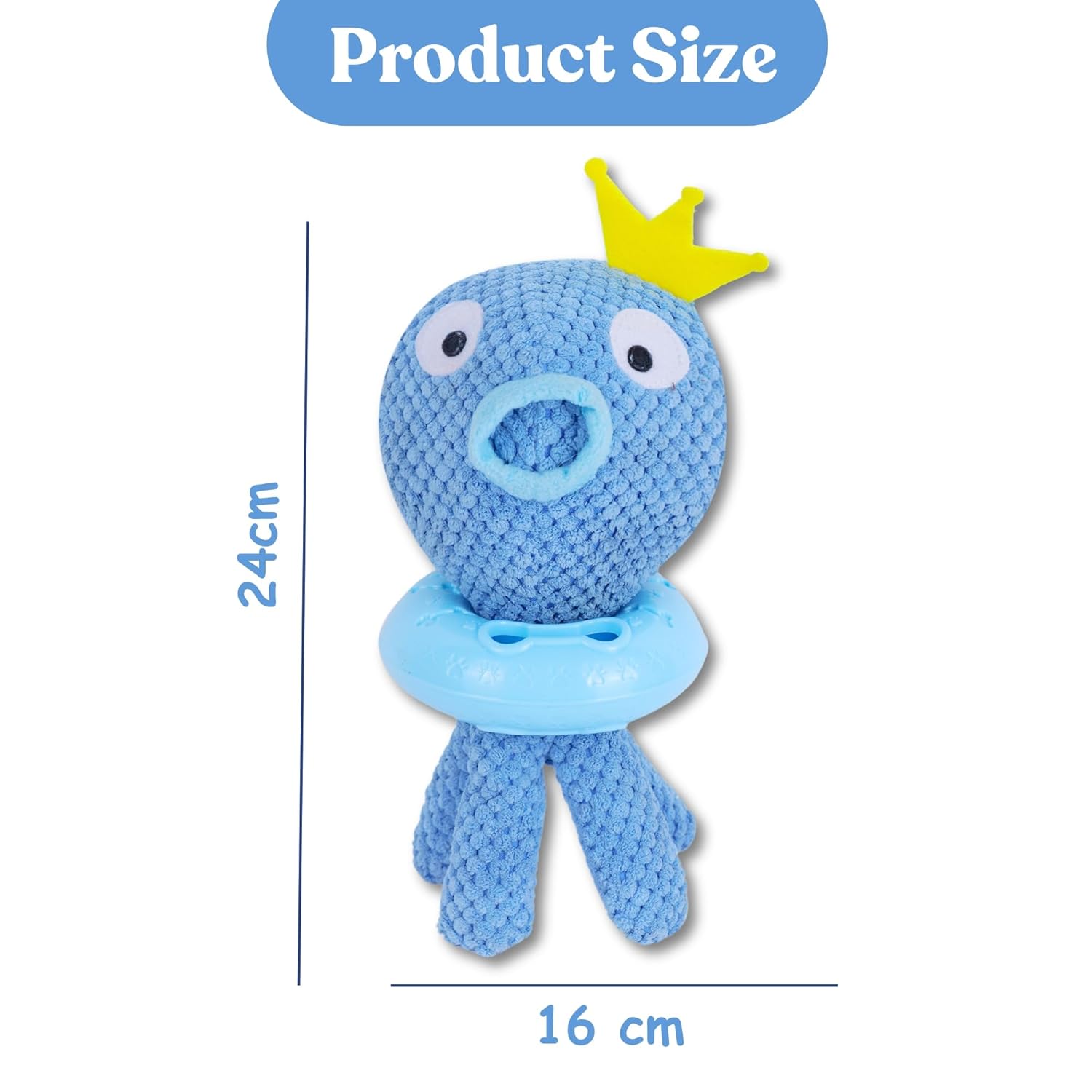 KEY FEATURES: The royal octopus design is cute and grabs your dog’s attention. The TPR puzzle feeder promotes slow feeding and mental stimulation. Five squeakers—one in the head and four in the legs—add extra fun. Made from thick polyester cotton with strong stitching for durability. Safe, non-toxic and odorless materials ensure worry-free chewing. Waterproof plush fabric is easy to clean and maintain. Perfect for tugging, chewing and fetching interactive play. Reduces anxiety and boredom, preventing destructive behaviour. Durable and sturdy, designed to withstand moderate chewing.